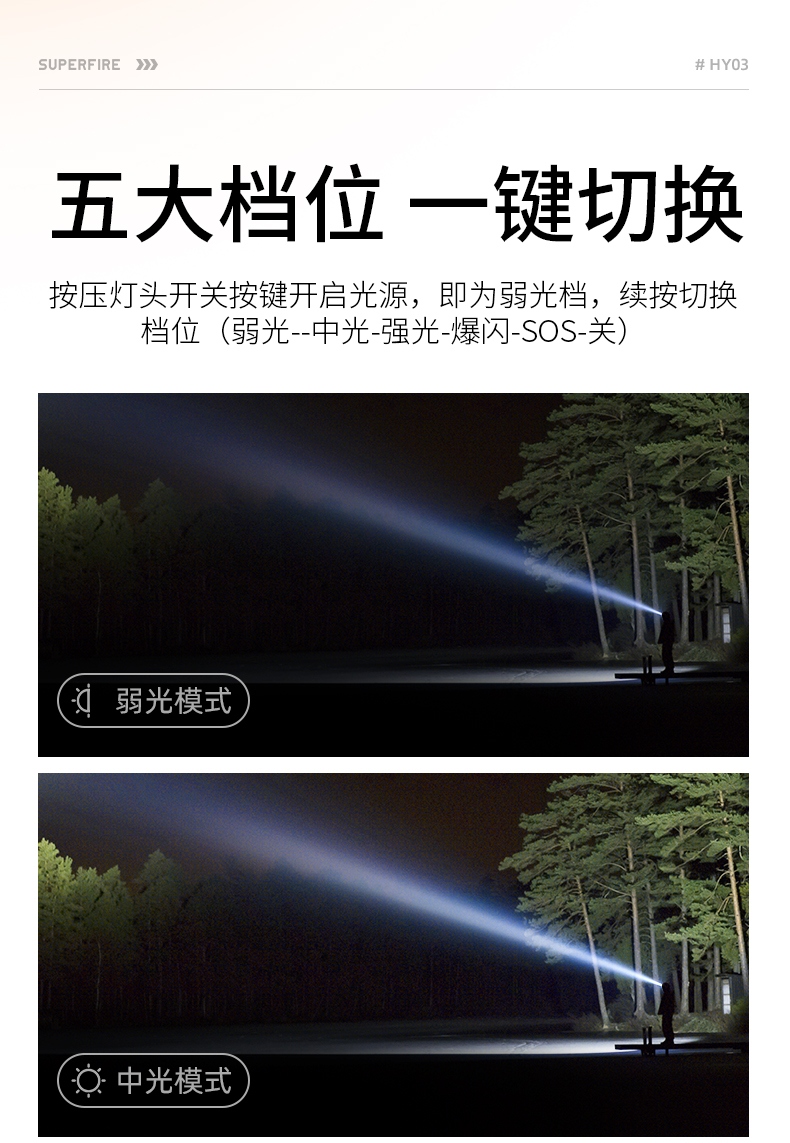 1、千米远射,射程更远,光斑更聚焦。 2、进口灯珠,亮度高,照明效果更好。 3、前后双按键,光源一键点亮,高亮瞬间开启。