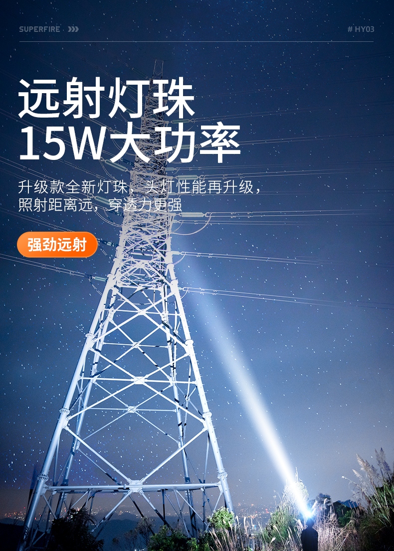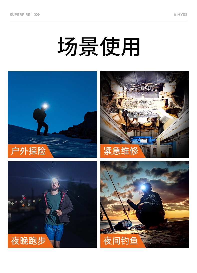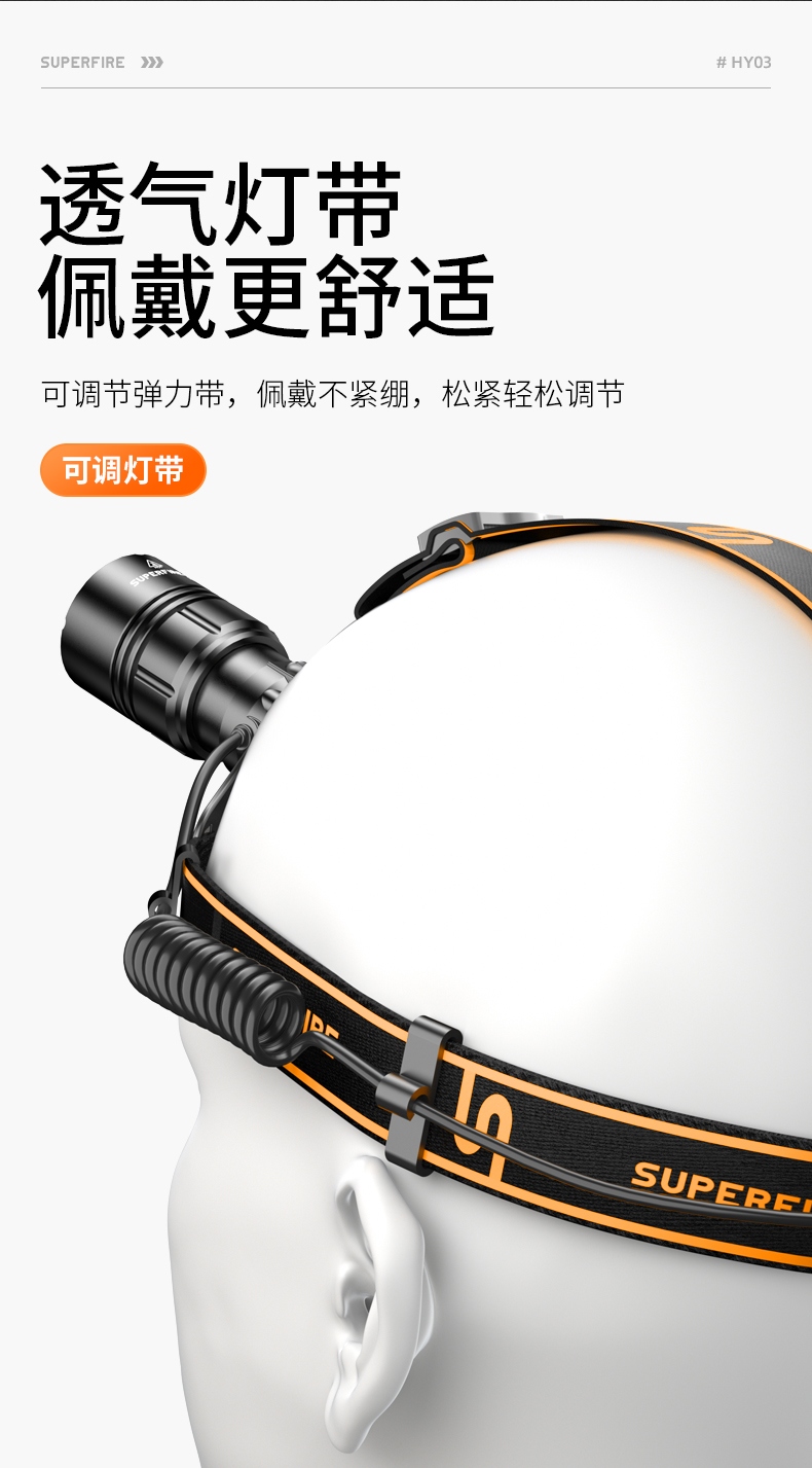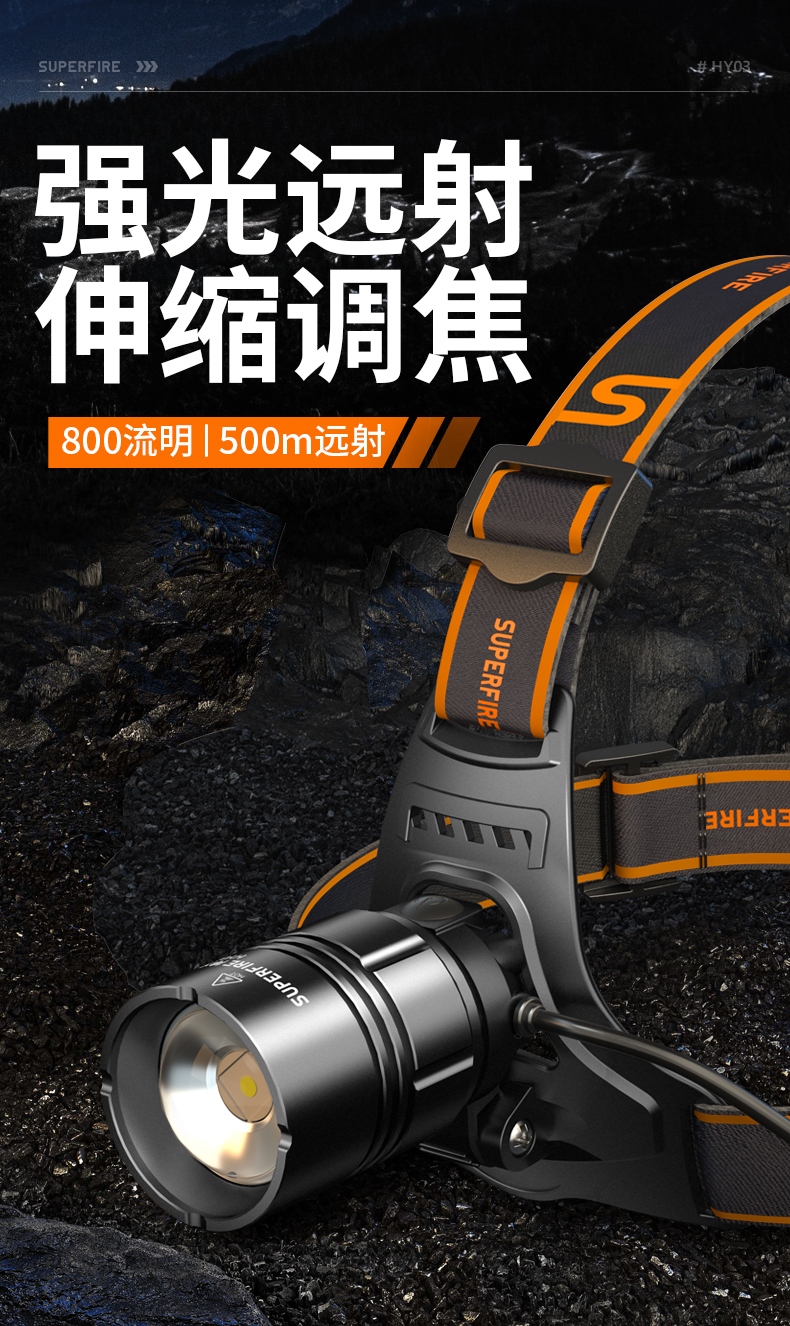 强光亮度,运动头灯,前后均衡设计,轻便不压头,可调节式头灯带,佩戴方便舒适,伸缩调焦,光照范围大,照射距离远,头灯角度调节,超90度角度随意调节,适宜各种环境使用