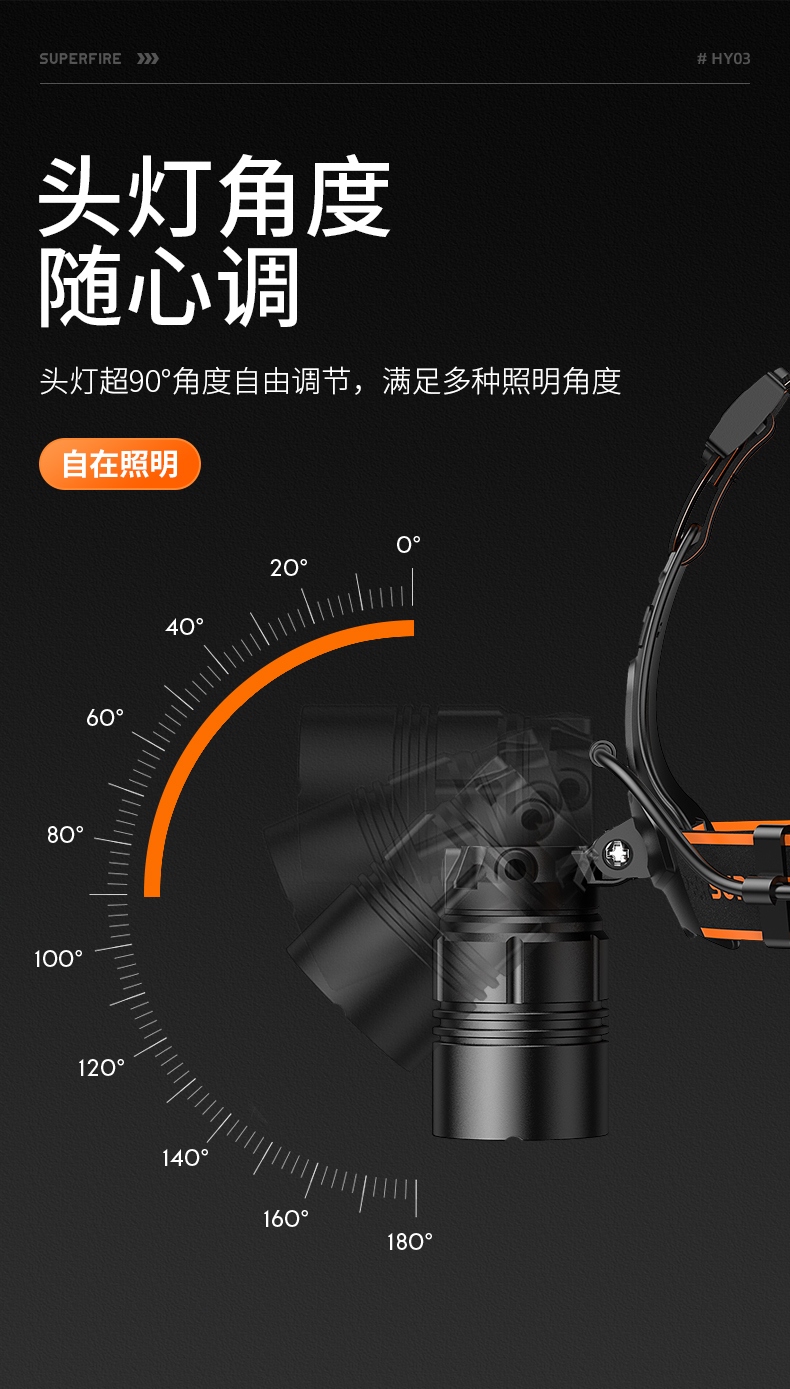 3、头灯角度调节:超90°角度随意调节,适宜各环境使用。