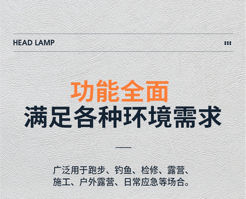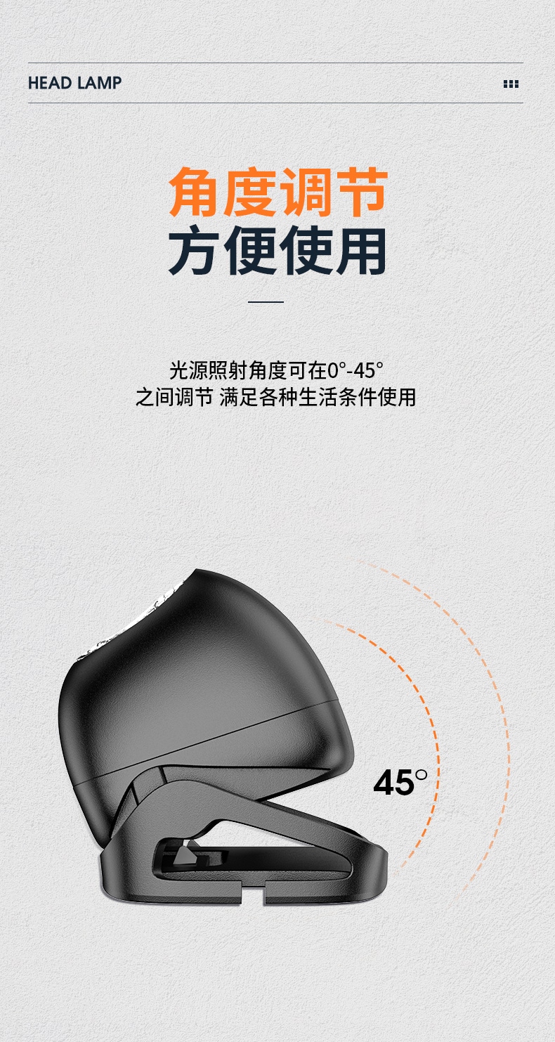强光亮度,运动头灯,前后均衡设计,轻便不压头,可调节式头灯带,佩戴方便舒适,伸缩调焦,光照范围大,照射距离远,头灯角度调节,超90度角度随意调节,适宜各种环境使用