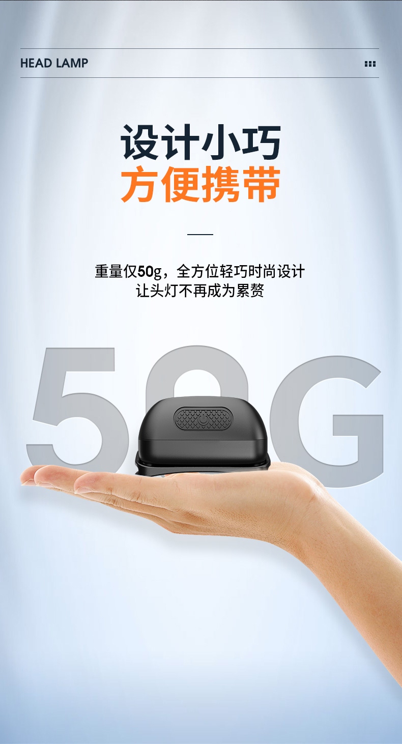 4、此款头灯款式潮流、设计小巧、携带方便、头带材质柔软、可自由拆卸、便于清洗。