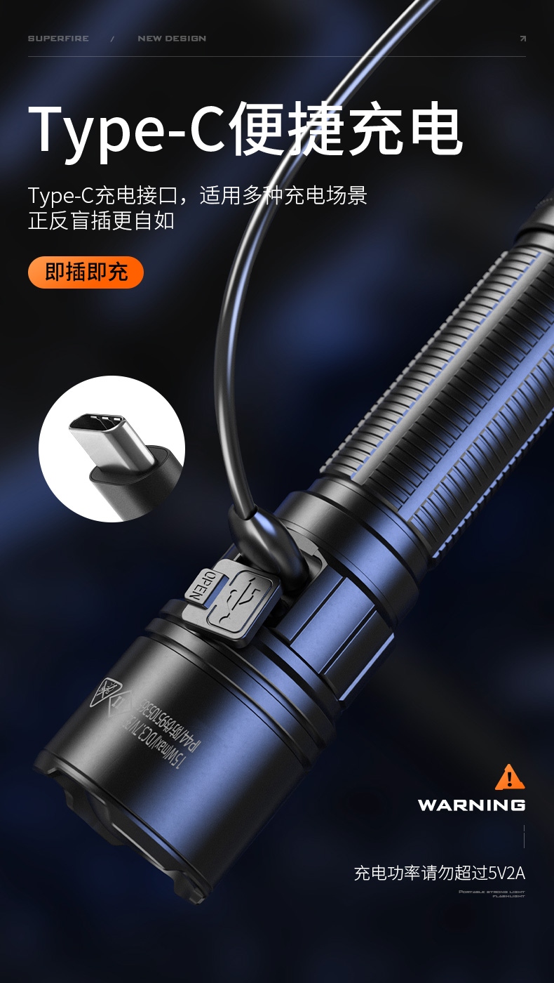 四档调光 Type-C充电 电量显示 铝合金筒身 持久续航 强力防水