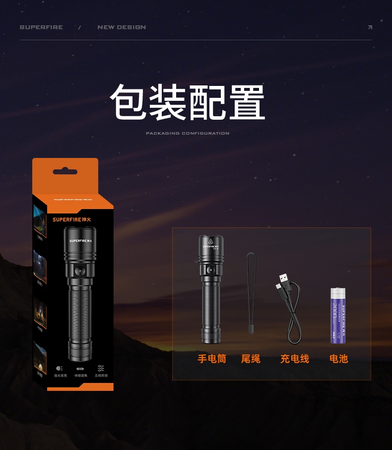 1、多档调光、可满足不同场景下的使用需求。 2、伸缩调焦、聚泛随心。