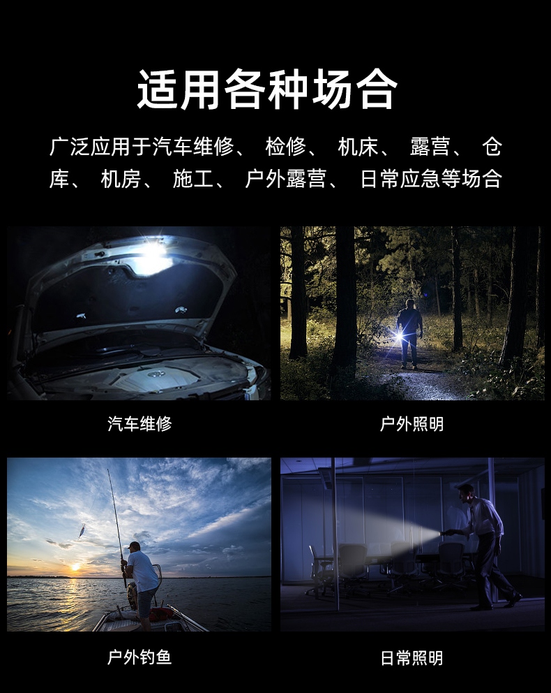 聚光主灯 亮度随心 轻按后端开关按钮,主灯强光点亮,续按依次切换主灯工作光-爆闪光。主灯开启状态下长按5秒,可实现光源色温转换。主灯关闭状态下长按5秒,可开启灯具最亮照明模式。 爆亮强光 亮如白昼 1500LM大功率高亮光源,点亮顷刻如白昼