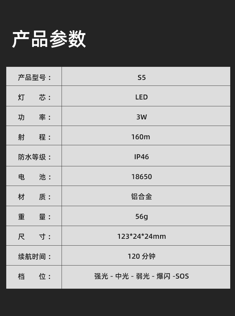 1、千米远射,射程更远,光斑更聚焦。 2、进口灯珠,亮度高,照明效果更好。 3、前后双按键,光源一键点亮,高亮瞬间开启。