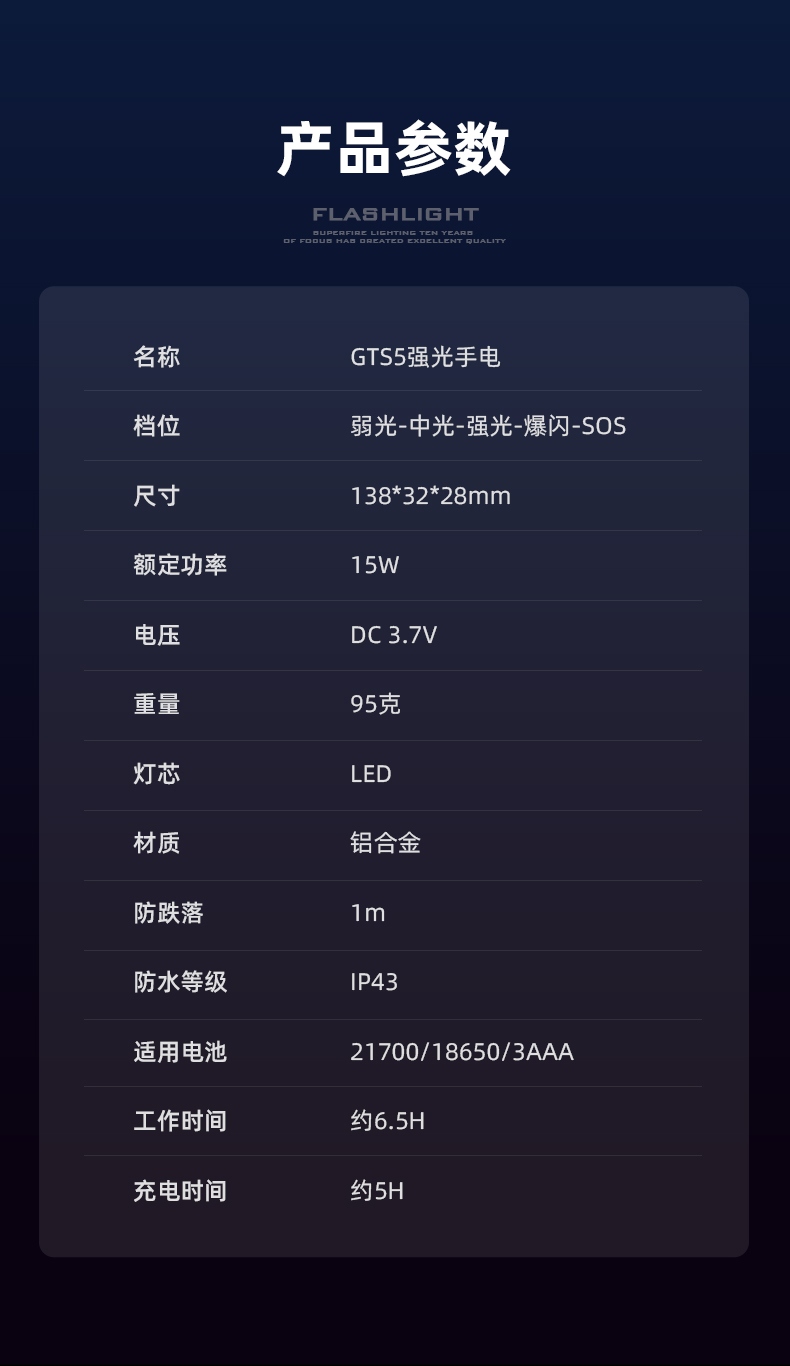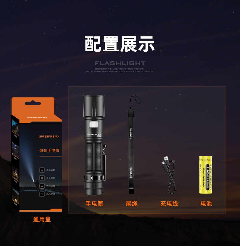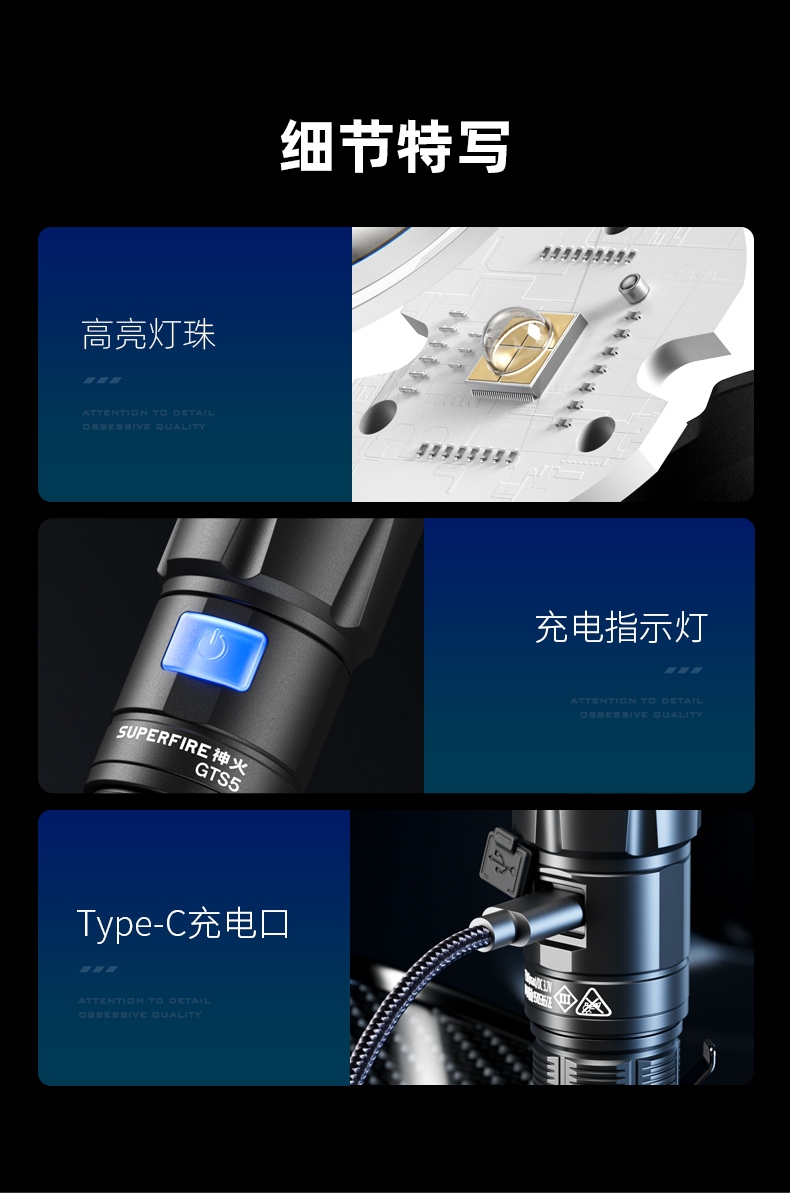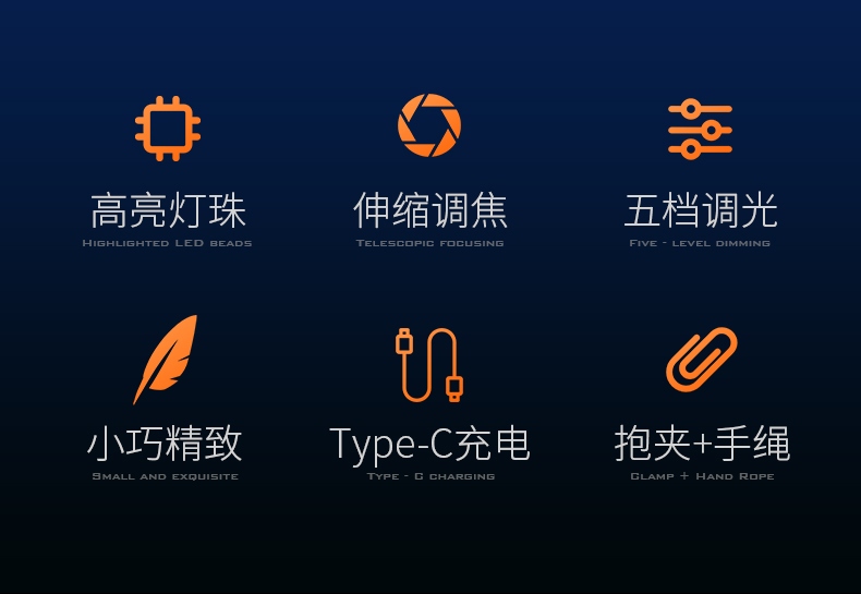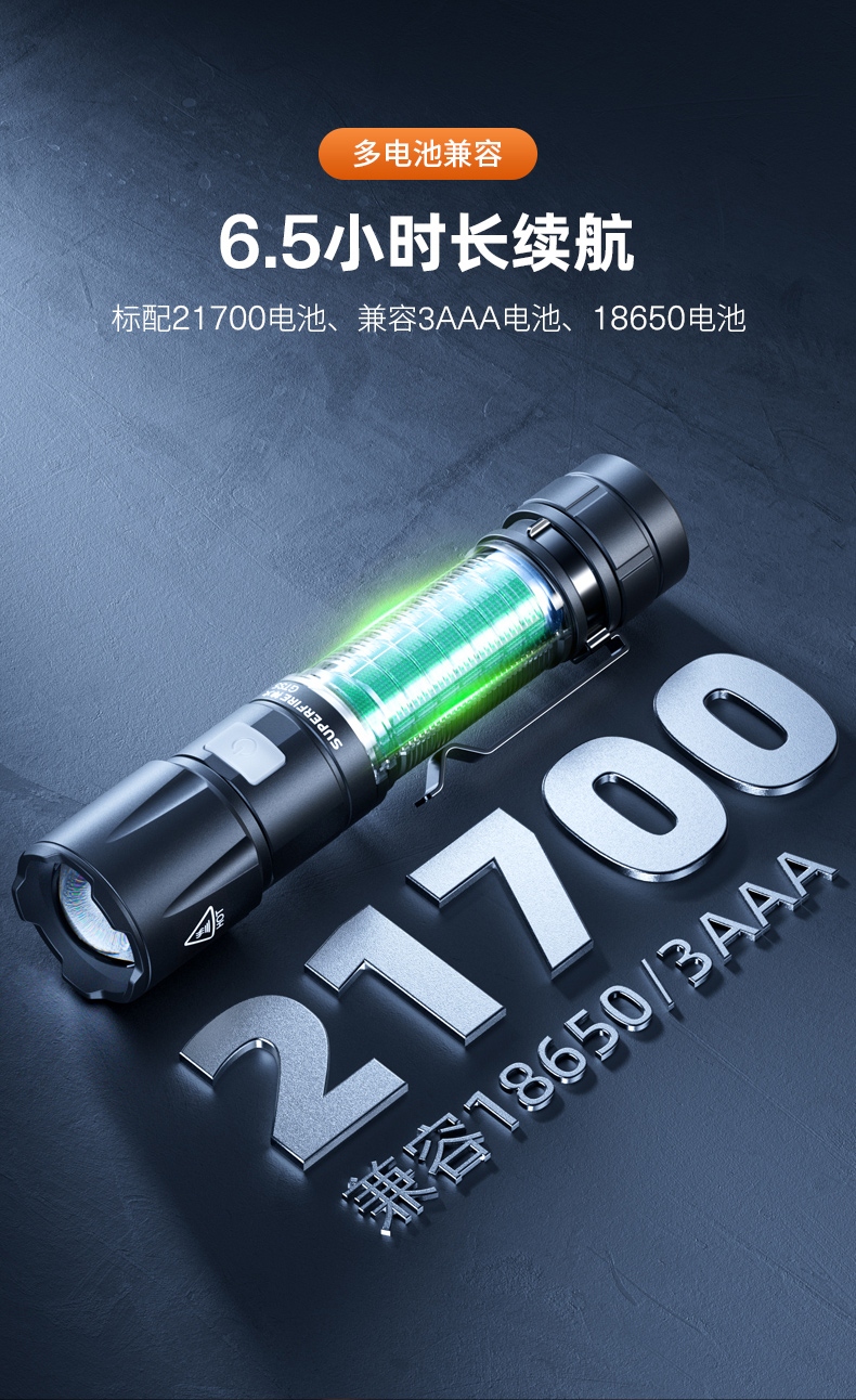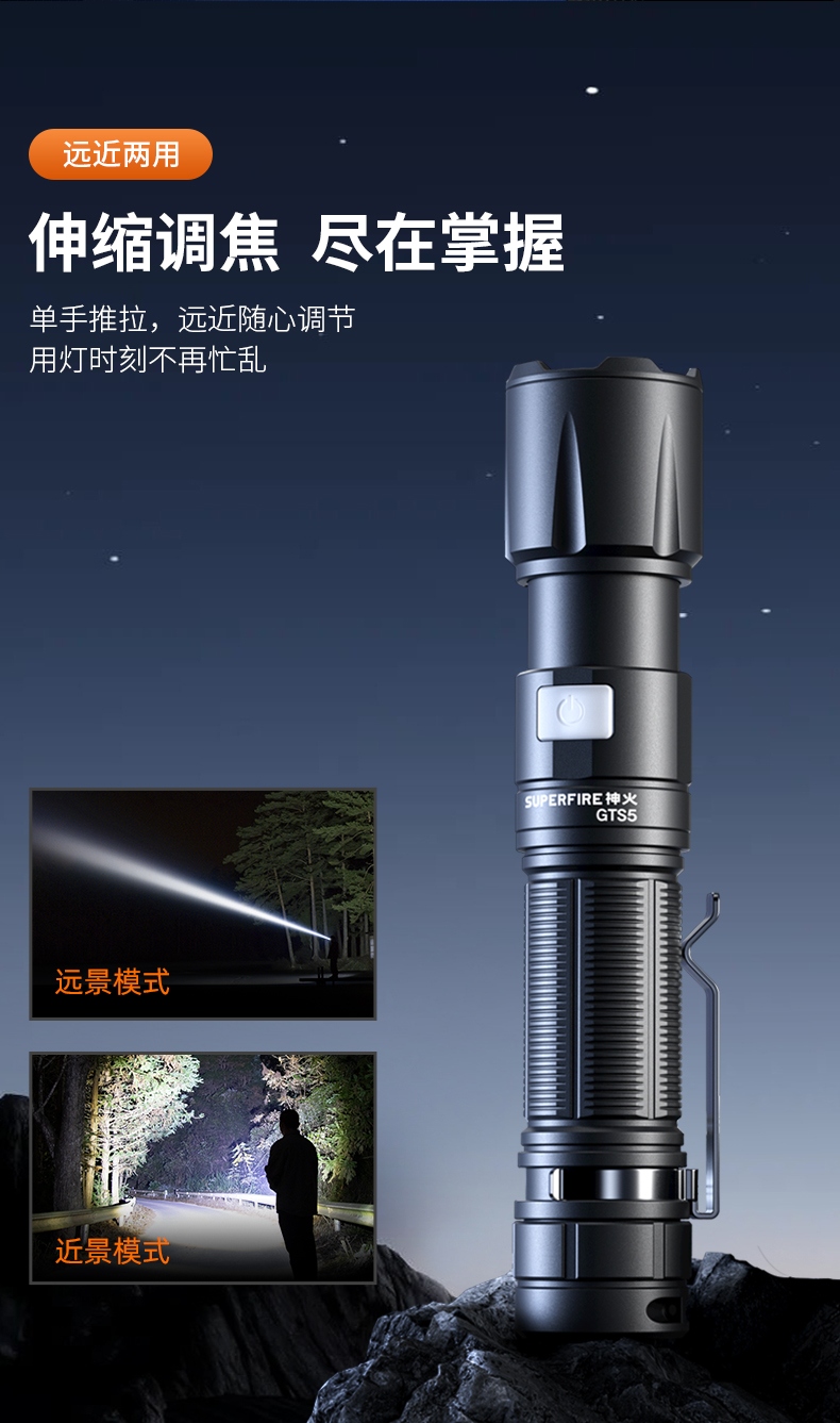 1、推拉灯头可实现伸缩调焦 2、聚光时圆形光斑,光斑圆润,照明效果更好 3、铝合金外壳,防水耐摔 4、多重安全程序,有效延长手电使用寿命 5、外观时尚,引领潮流 6、多种电池兼容,满足不同客户需求 7、Type-c充电,正反盲插。 8、含腰夹及手绳孔设计,