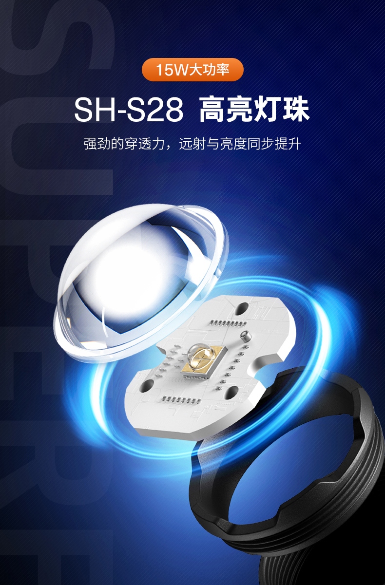 聚光主灯 亮度随心 轻按后端开关按钮,主灯强光点亮,续按依次切换主灯工作光-爆闪光。主灯开启状态下长按5秒,可实现光源色温转换。主灯关闭状态下长按5秒,可开启灯具最亮照明模式。 爆亮强光 亮如白昼 1500LM大功率高亮光源,点亮顷刻如白昼