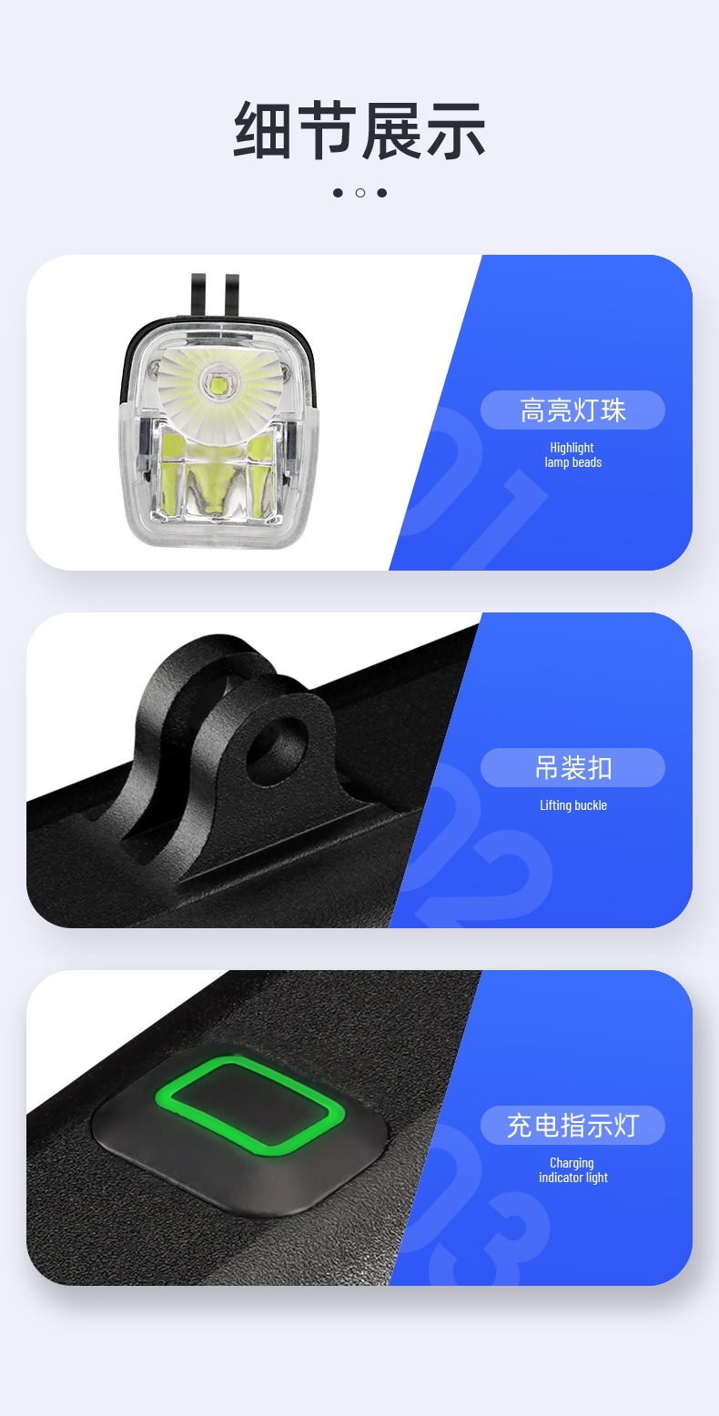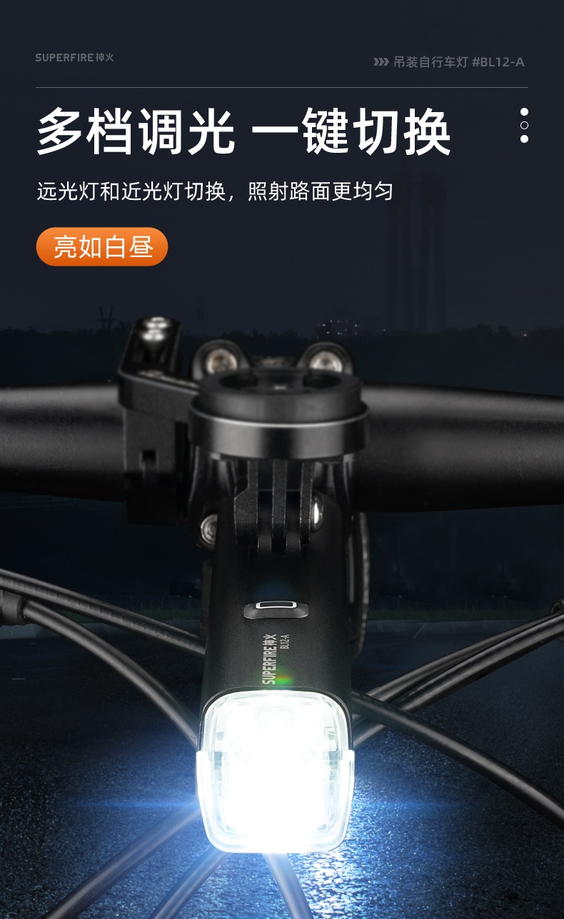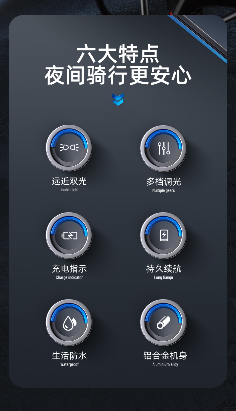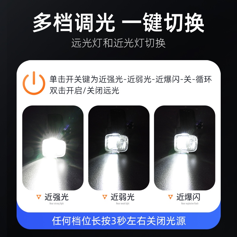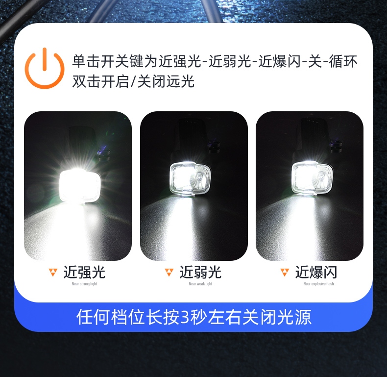 1、按开关键开启光源,档位依次:近强光-近弱光-近爆闪-关-循环。 2、双击开启/关闭远光。任何挡位长按3秒左右关闭光源。 3、充电亮红灯,充满亮绿灯 4、多档调光,一键切换。安装拆卸方便。