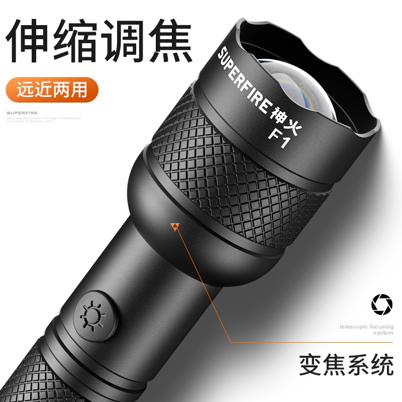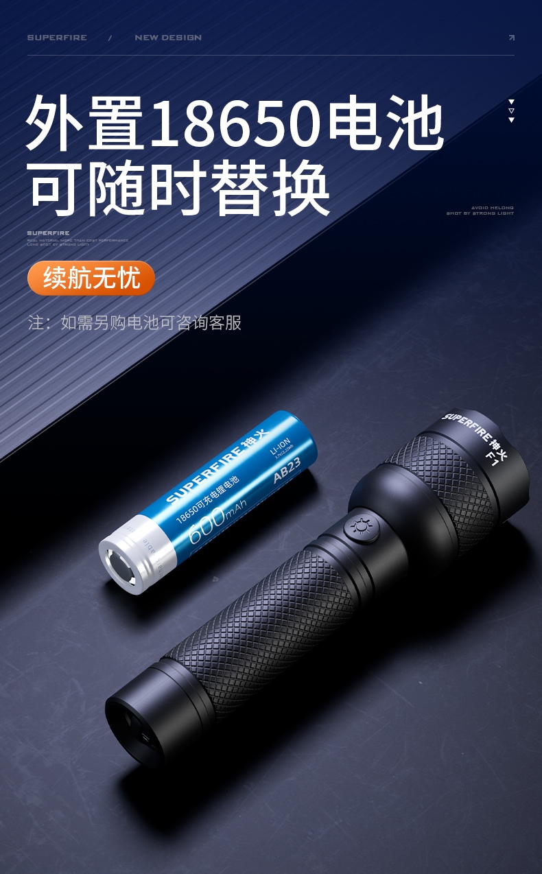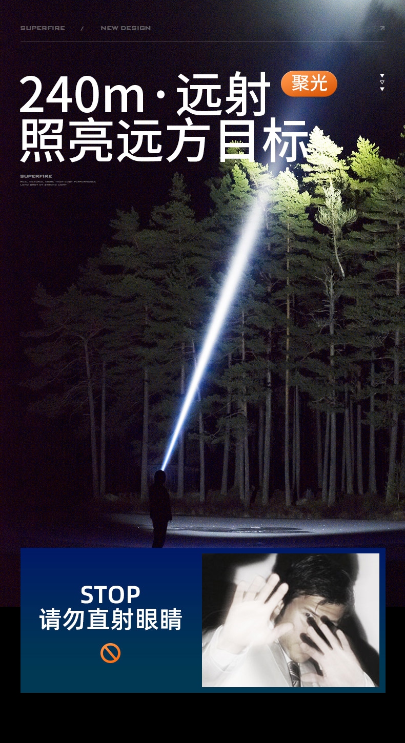1、千米远射,射程更远,光斑更聚焦。 2、进口灯珠,亮度高,照明效果更好。 3、前后双按键,光源一键点亮,高亮瞬间开启。