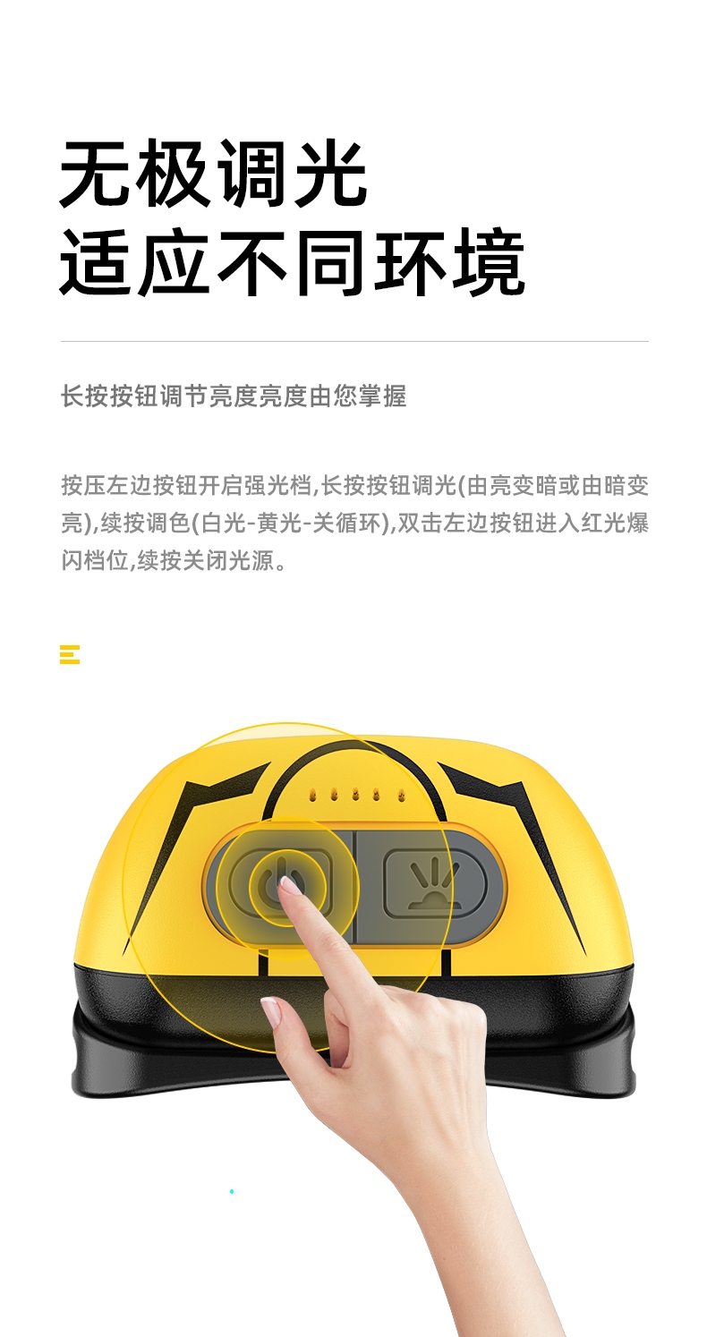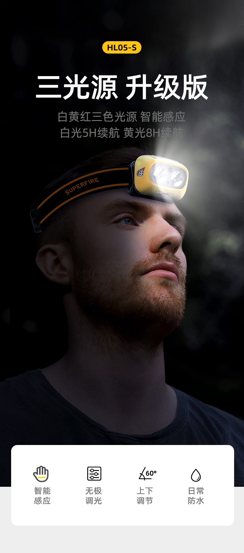 三光源(白光+黄光+红光),长按开关可无极调光,带常规和感应双模式