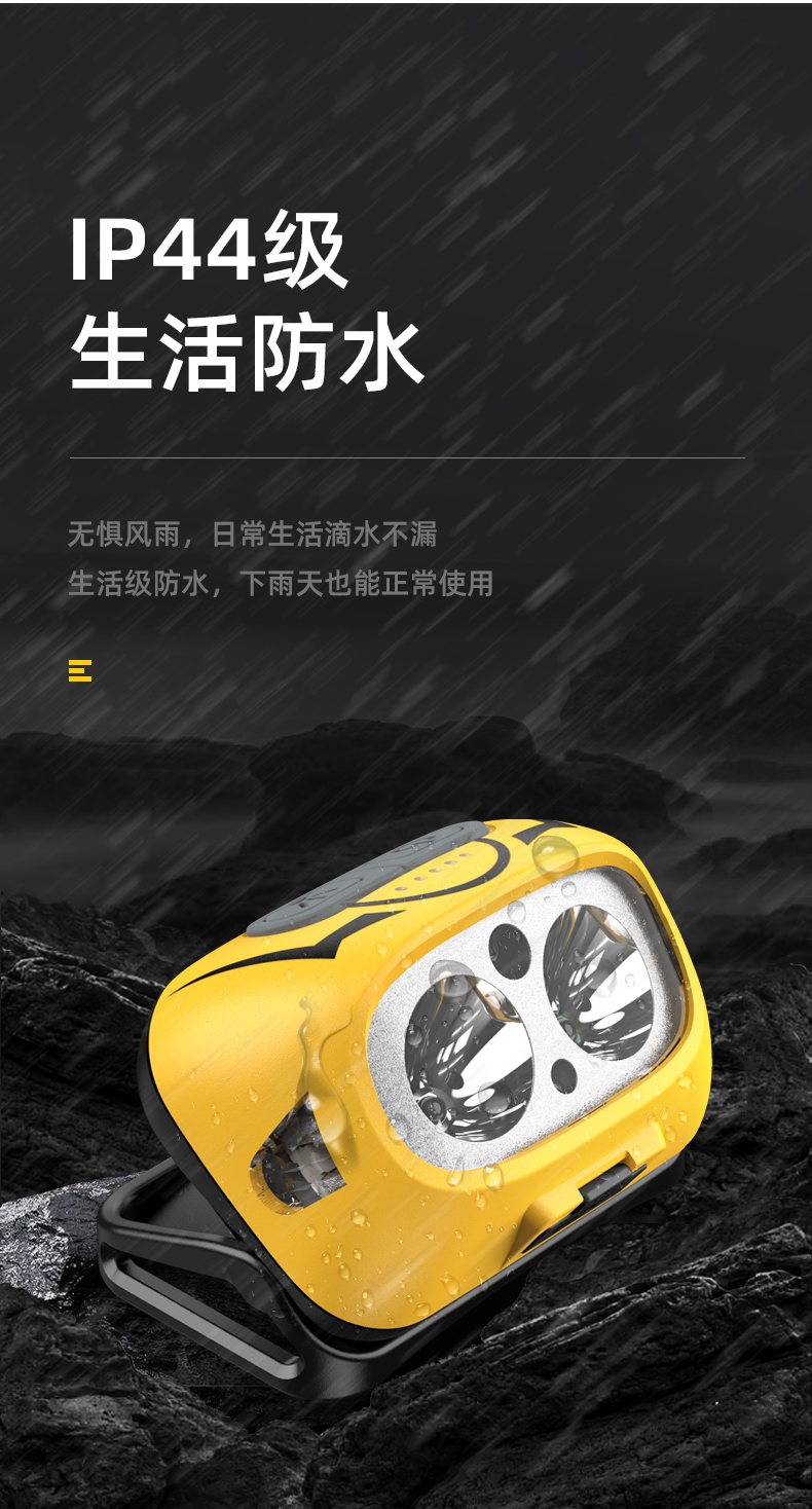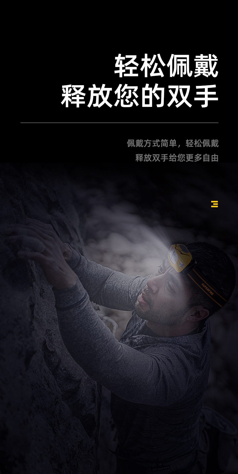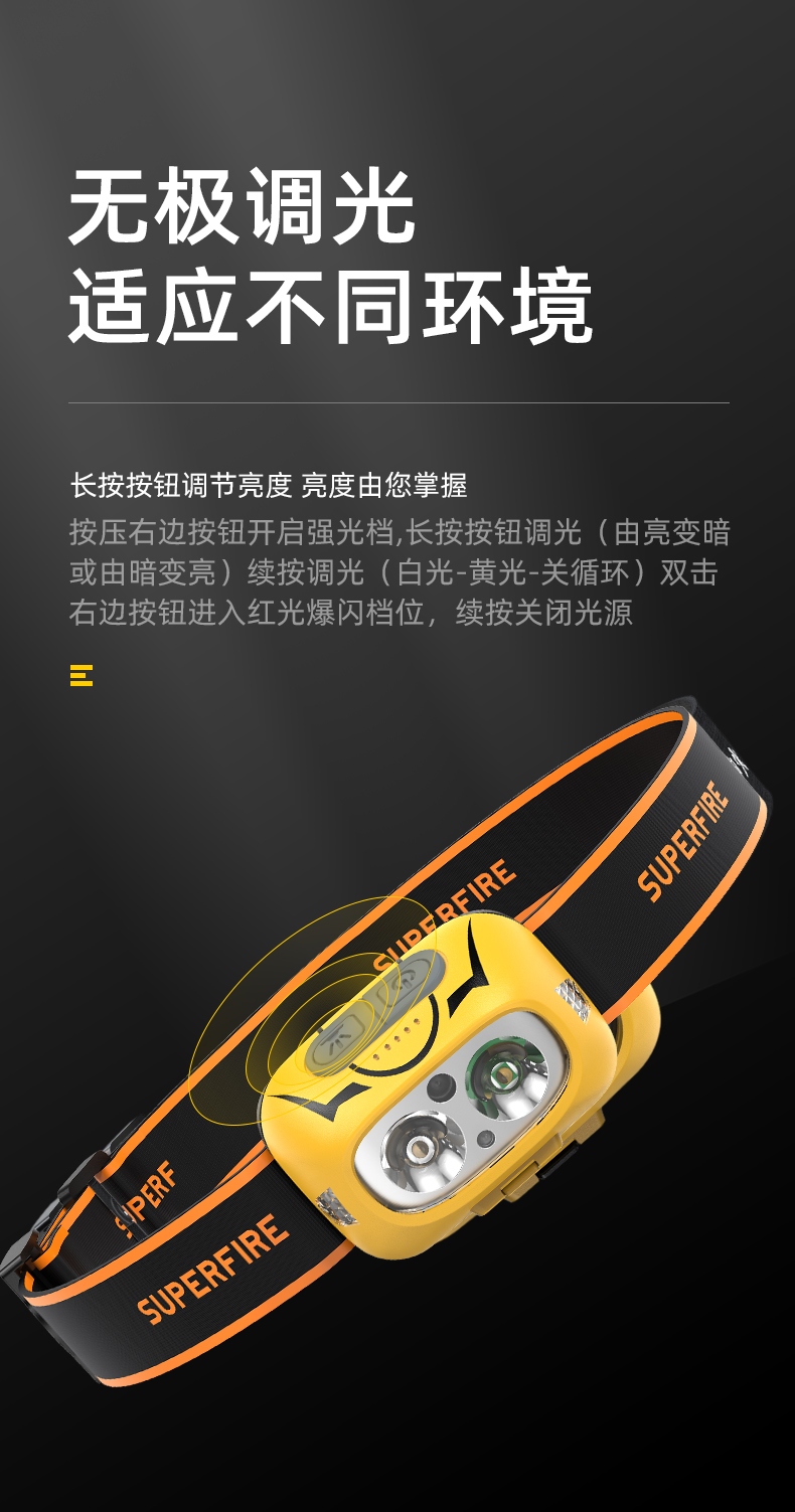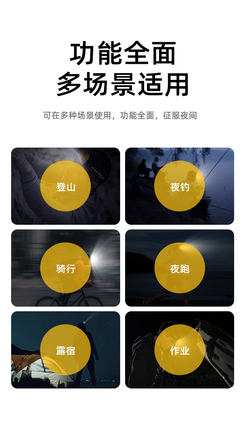 强光亮度,运动头灯,前后均衡设计,轻便不压头,可调节式头灯带,佩戴方便舒适,伸缩调焦,光照范围大,照射距离远,头灯角度调节,超90度角度随意调节,适宜各种环境使用