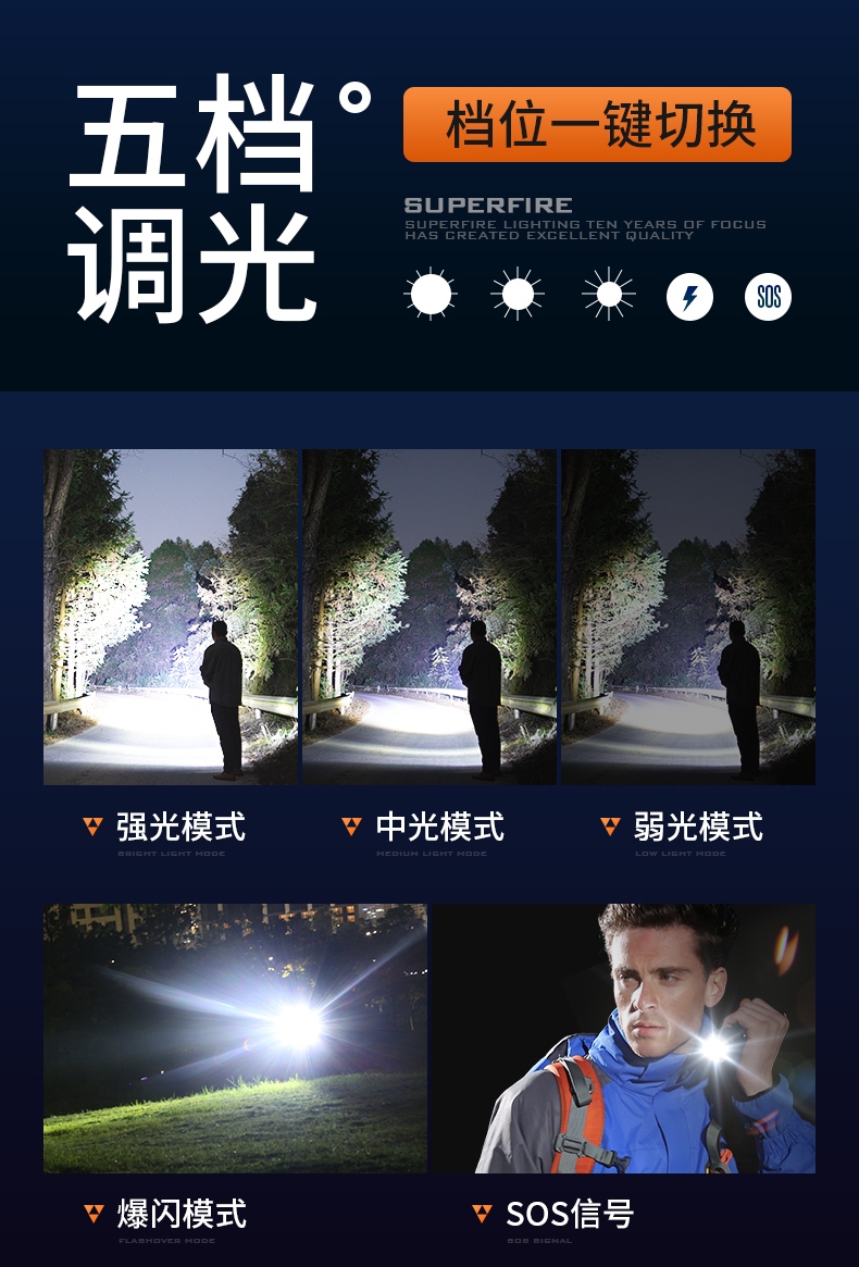 1、六档调光,可满足不同使用场景下的照明需求。 2、进口高亮朗明纳斯灯珠,照明效果更好。 3、含档位记忆,任意档位快捷关机 ,开机恢复关机前档位。