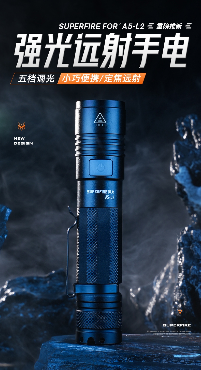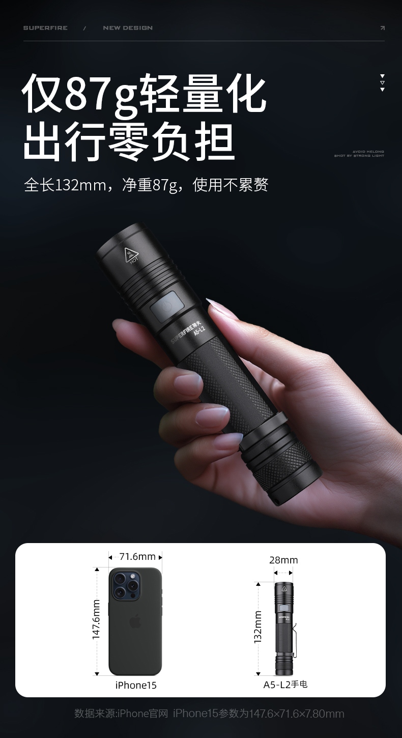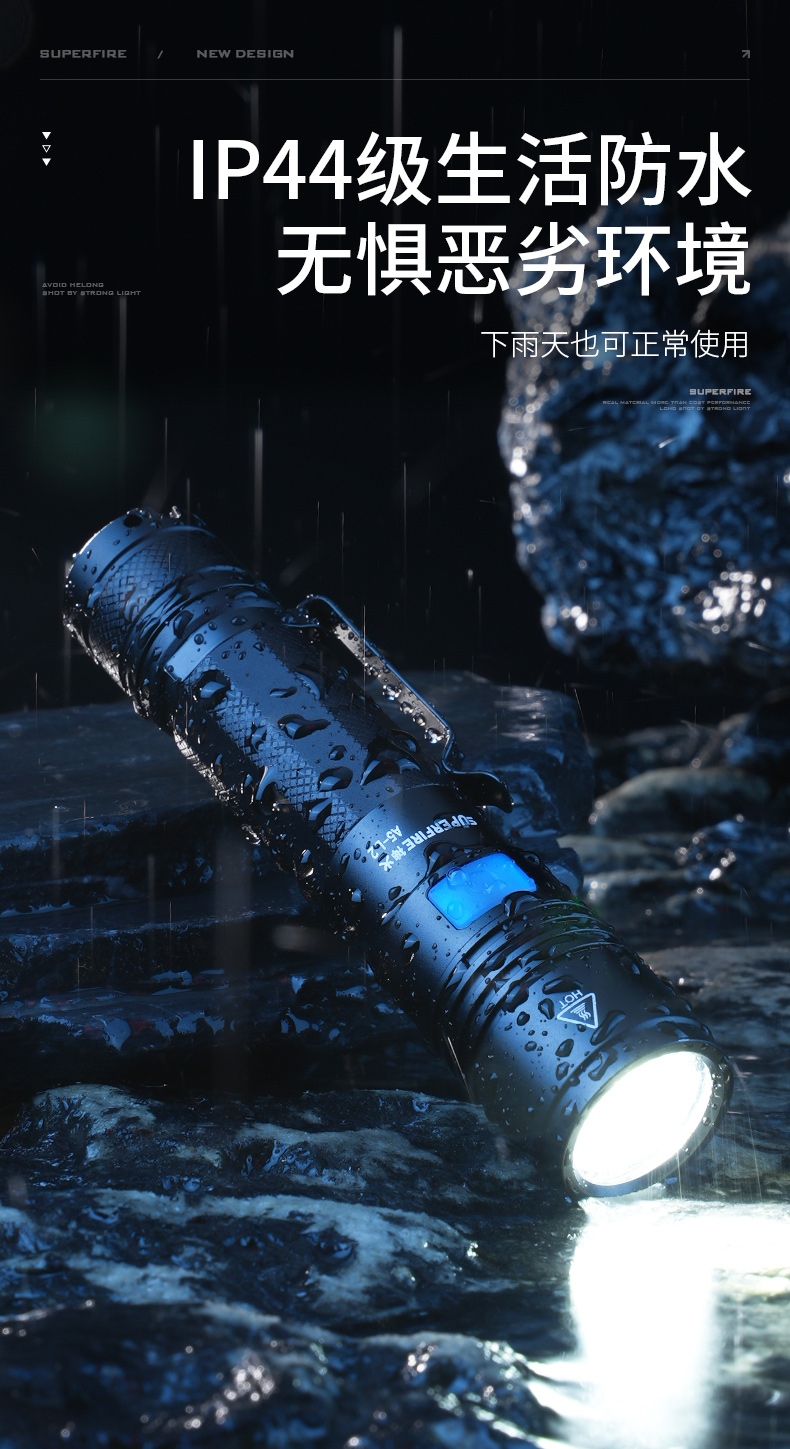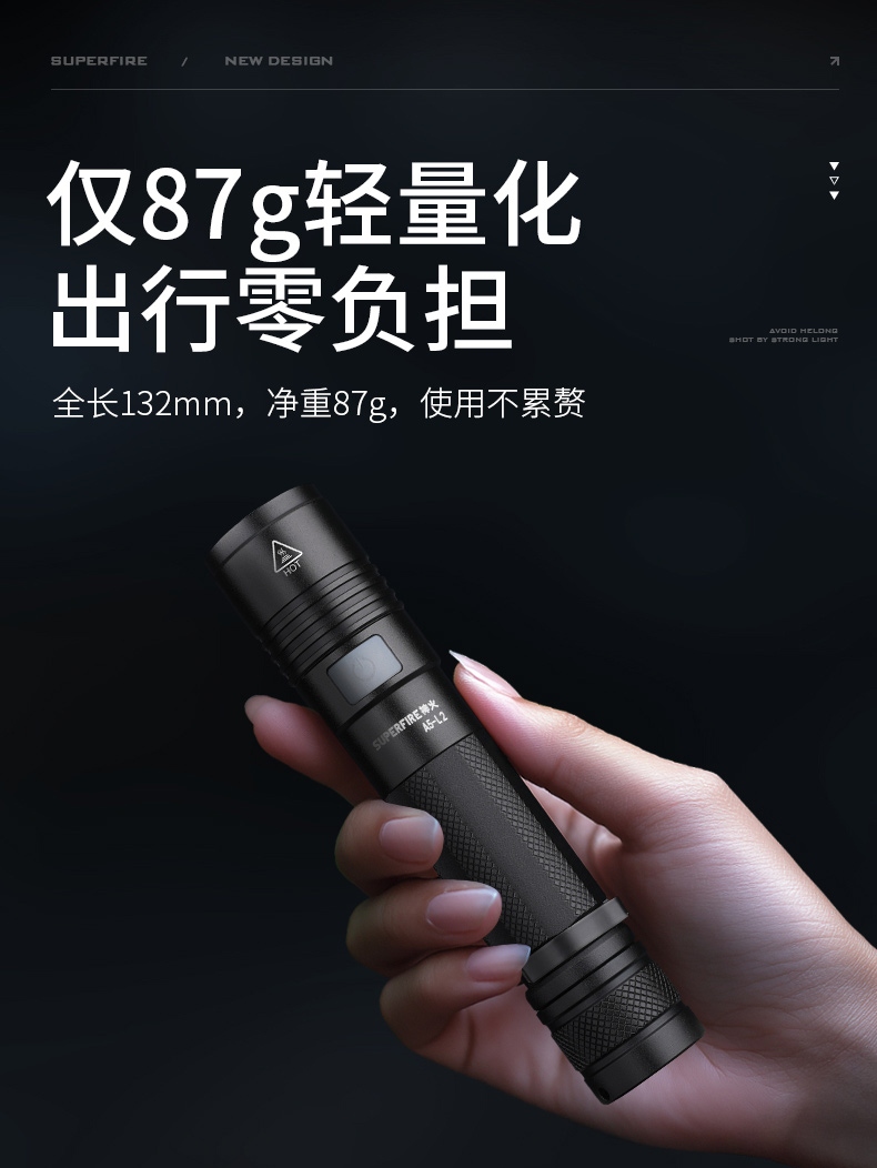 1、多档调光,可满足不同使用场景下的照明需求。 2、多种安全程序,可有效保护手电使用安全,延长手电使用寿命。 3、非精致外观,时尚小巧。