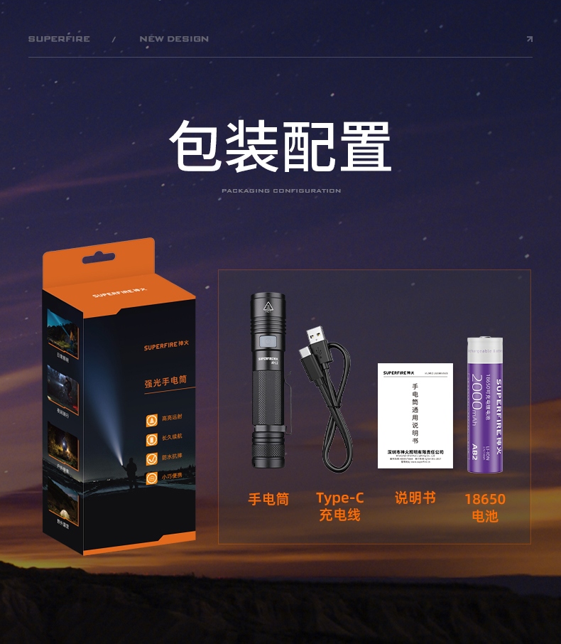 四档调光 Type-C充电 电量显示 铝合金筒身 持久续航 强力防水