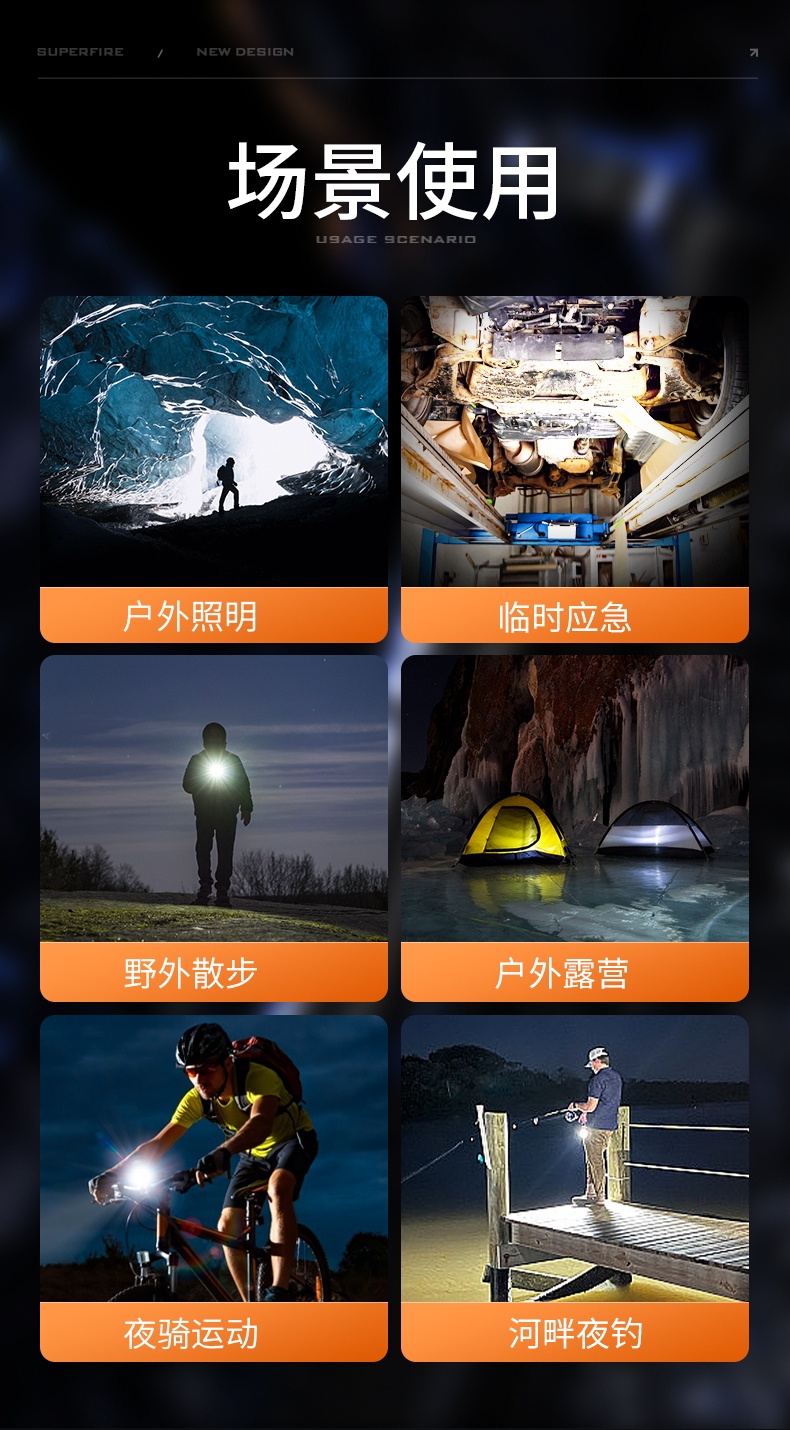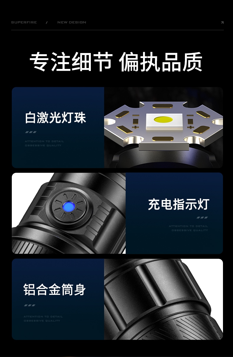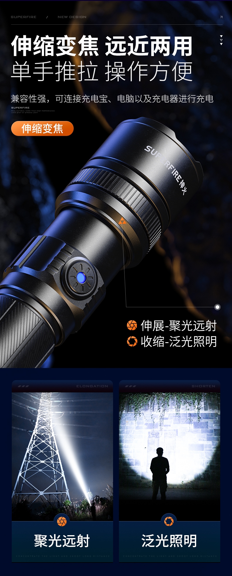 1.伸缩调焦、聚泛随心。 2.多电池兼容,兼容21700/18650/AAA电池
