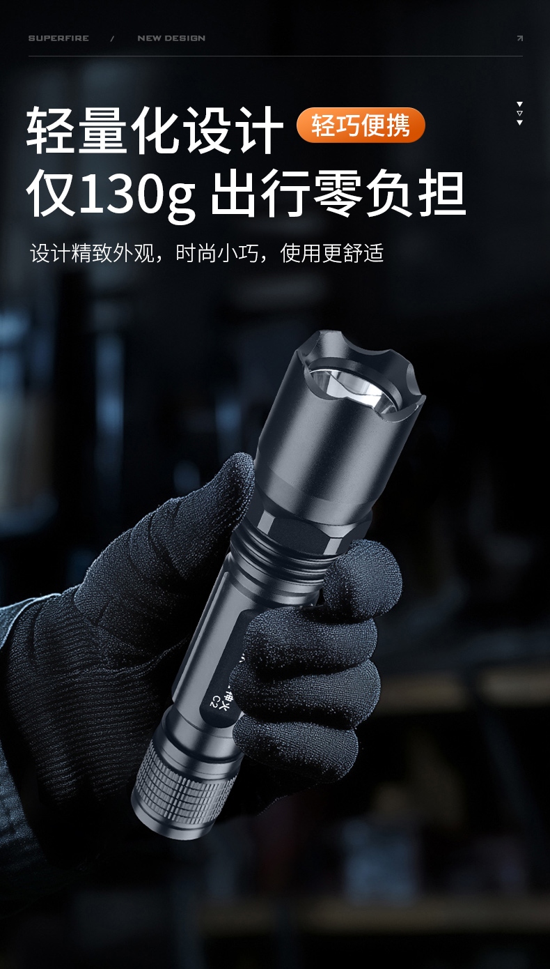 1、3档调光,可满足不同使用场景下的照明需求。 2、多种安全程序,可有效保护手电使用安全,延长手电使用寿命。 3、精致外观,时尚小巧。
