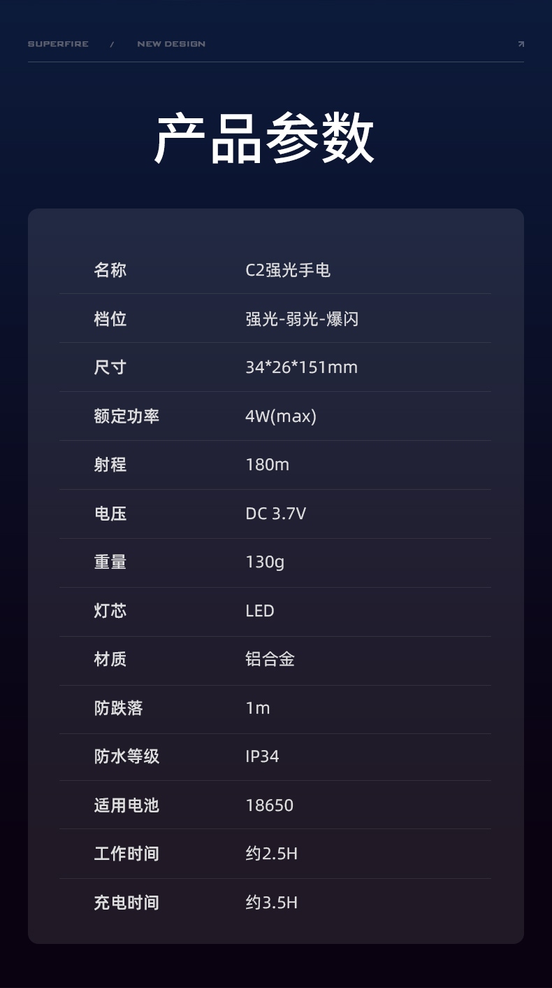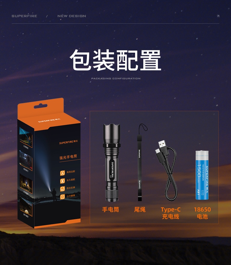 四档调光 Type-C充电 电量显示 铝合金筒身 持久续航 强力防水