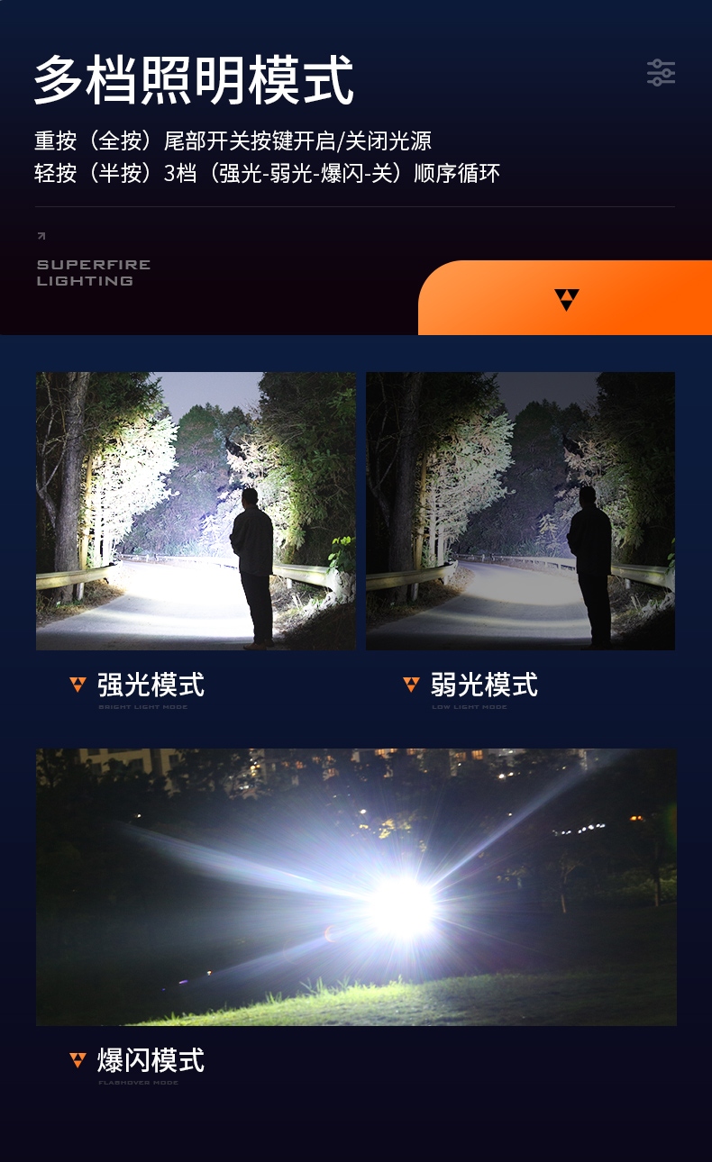 聚光主灯 亮度随心 轻按后端开关按钮,主灯强光点亮,续按依次切换主灯工作光-爆闪光。主灯开启状态下长按5秒,可实现光源色温转换。主灯关闭状态下长按5秒,可开启灯具最亮照明模式。 爆亮强光 亮如白昼 1500LM大功率高亮光源,点亮顷刻如白昼