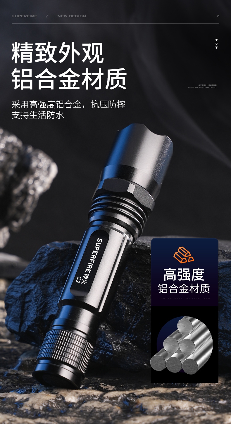 6、铝合金筒身,防水耐摔。