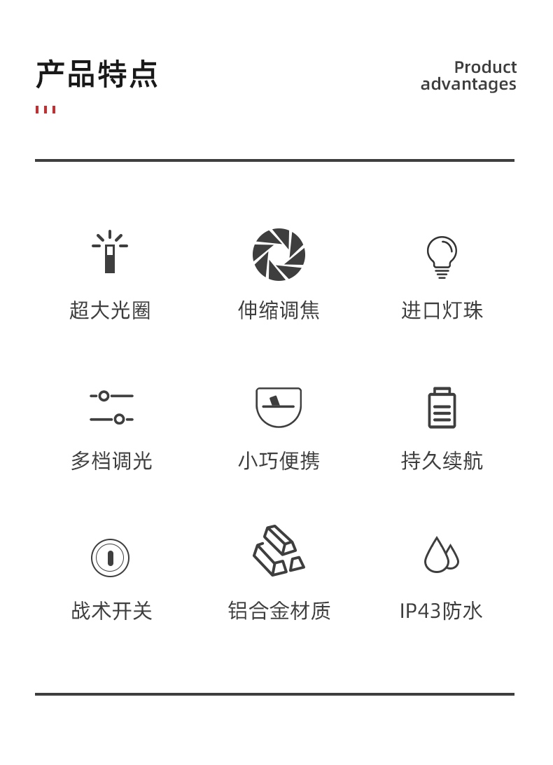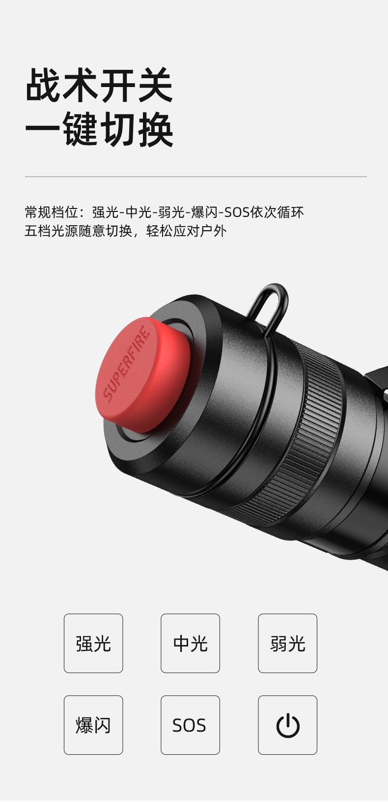 1、千米远射,射程更远,光斑更聚焦。 2、进口灯珠,亮度高,照明效果更好。 3、前后双按键,光源一键点亮,高亮瞬间开启。