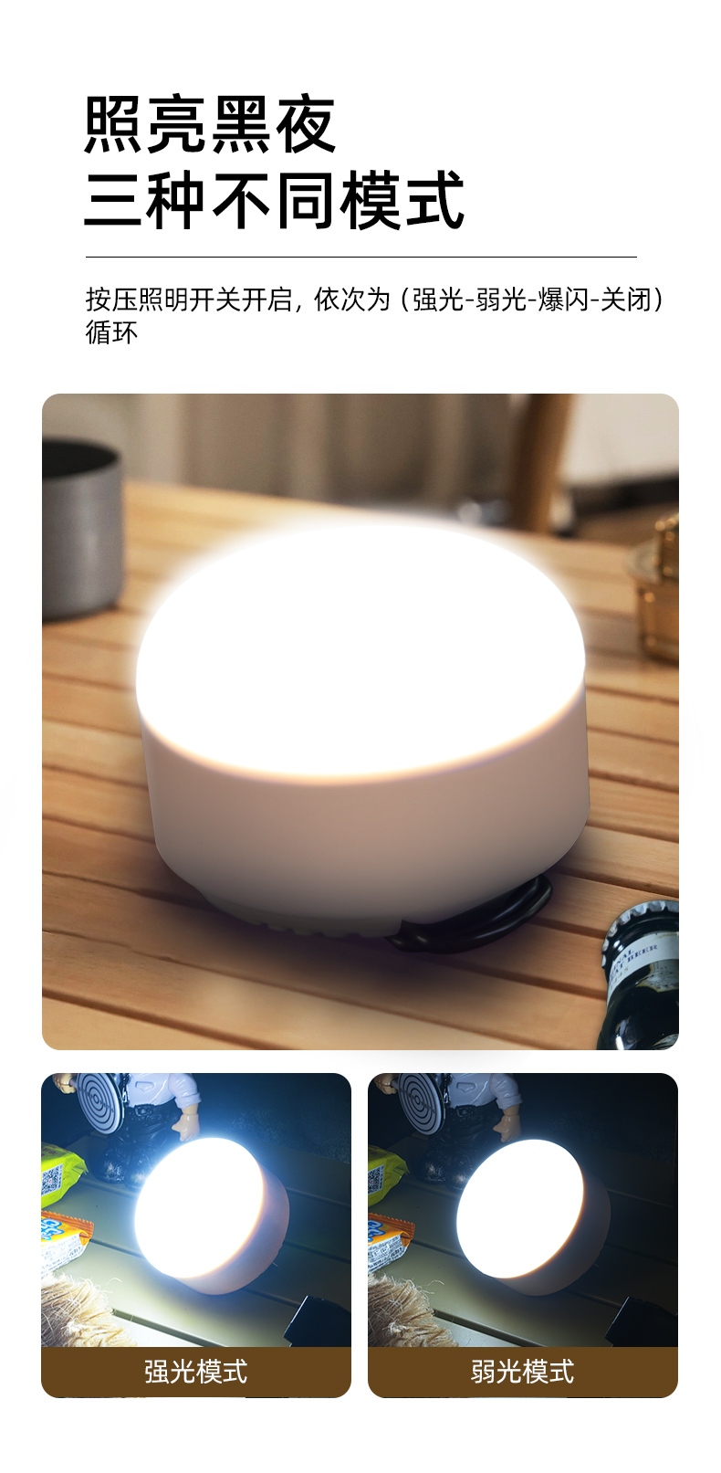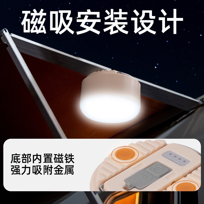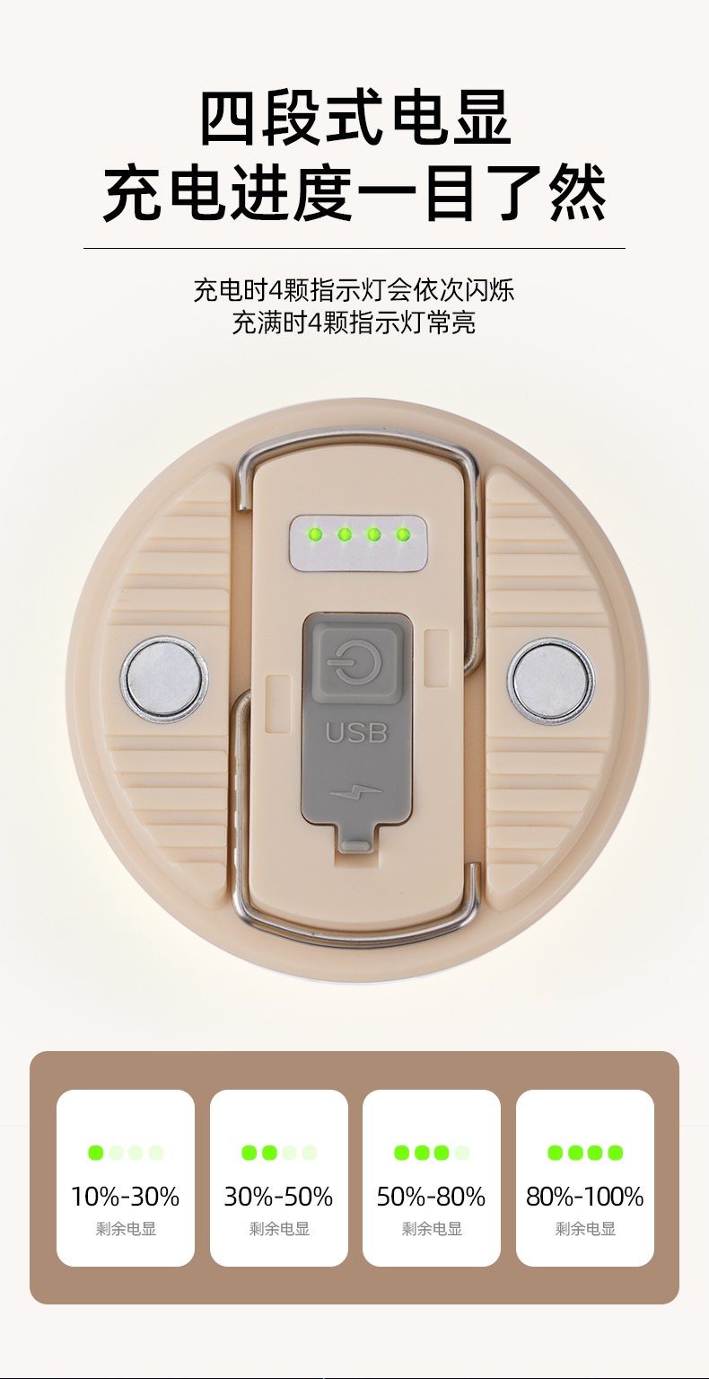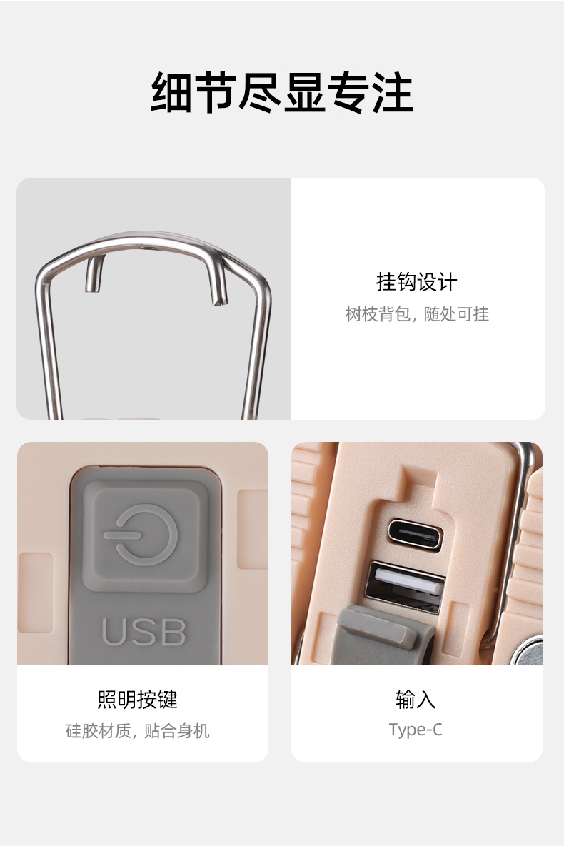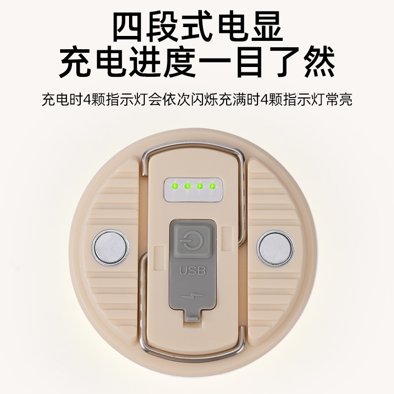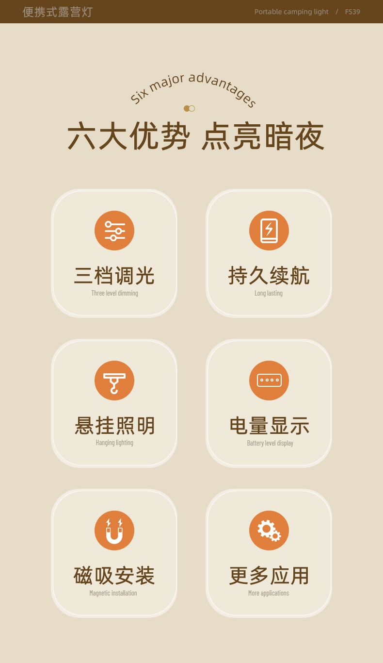 六大优势 点亮暗夜 三档调光 持久续航 磁吸安装 电量显示 悬挂照明
