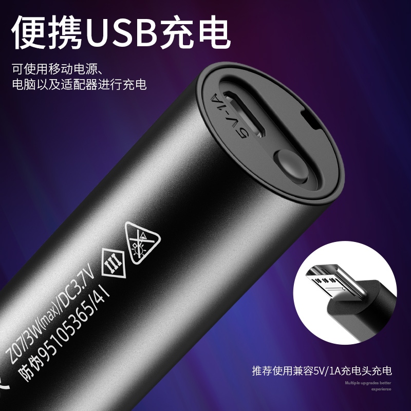 1、紫光手电:可用于验钞、识别荧光剂,宠物荧光检测,鉴别琥珀、蜜蜡,古玩修补鉴定。 2、单档开关,操作便捷。