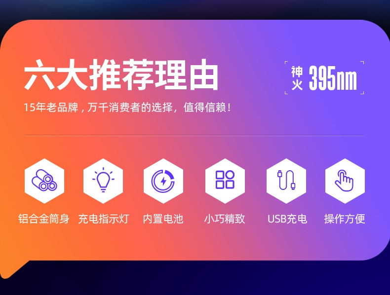6、纯净紫光:395nm紫光,多功能,可检测荧光、病菌、防伪。