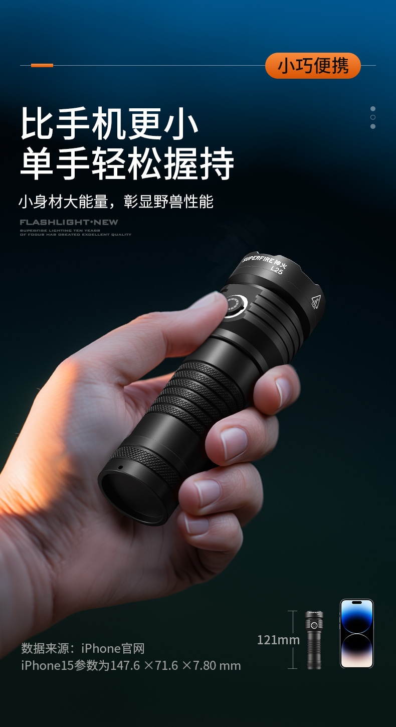 1、千米远射,射程更远,光斑更聚焦。 2、进口灯珠,亮度高,照明效果更好。 3、前后双按键,光源一键点亮,高亮瞬间开启。