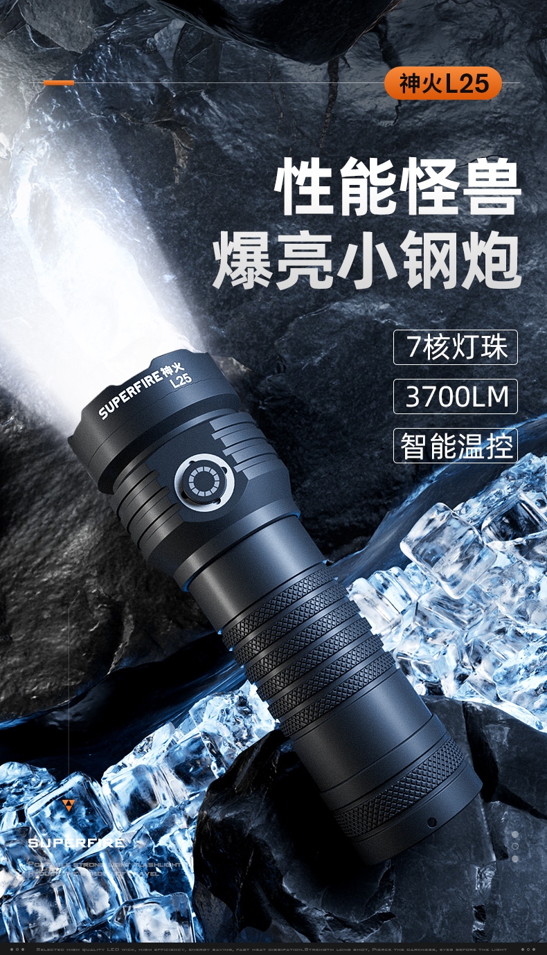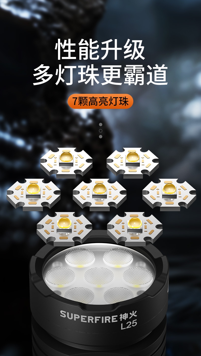 1、精致外观,含手绳,时尚小巧,方便携带。 2、7颗高亮灯珠,亮度高,照明效果更好。 3、多种安全程序,可有效保护手电使用安全,延长手电使用寿命。