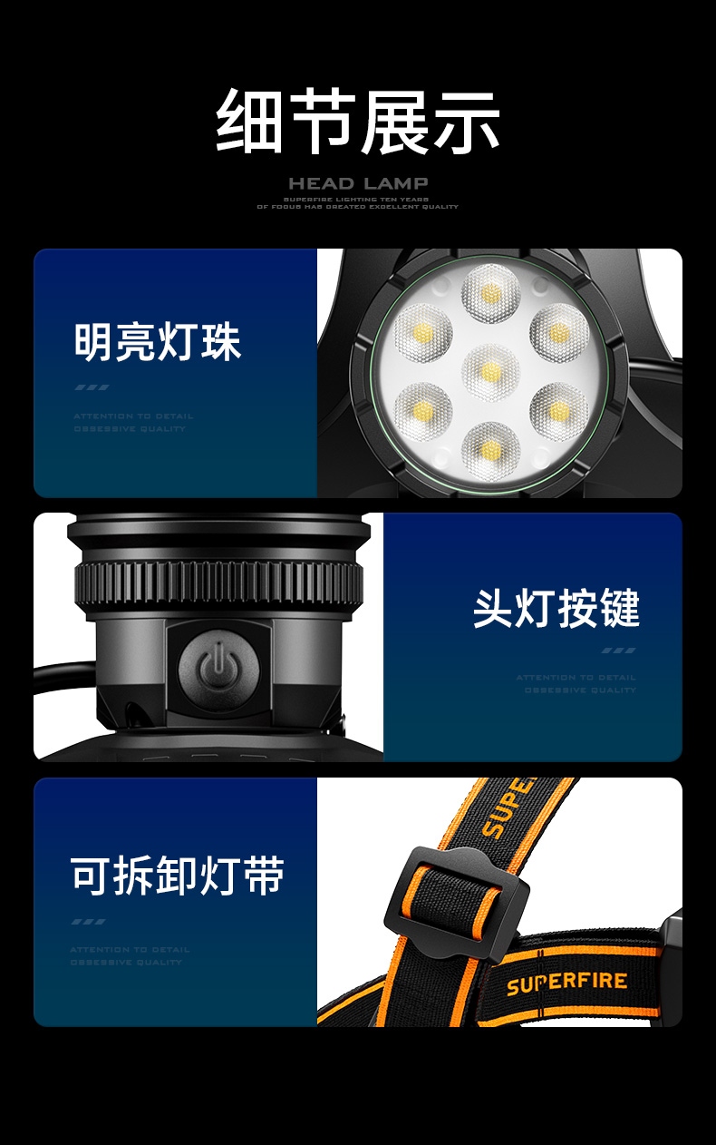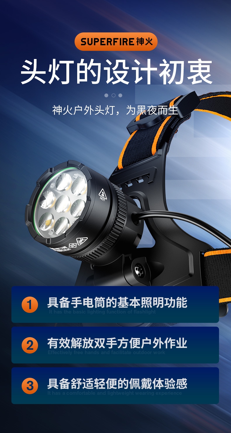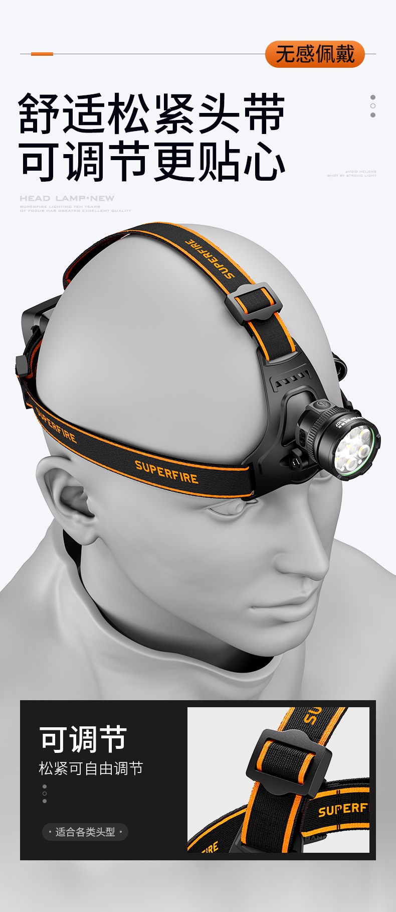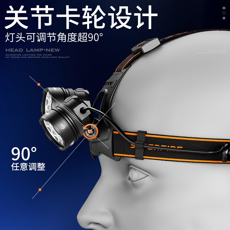 强光亮度,运动头灯,前后均衡设计,轻便不压头,可调节式头灯带,佩戴方便舒适,伸缩调焦,光照范围大,照射距离远,头灯角度调节,超90度角度随意调节,适宜各种环境使用