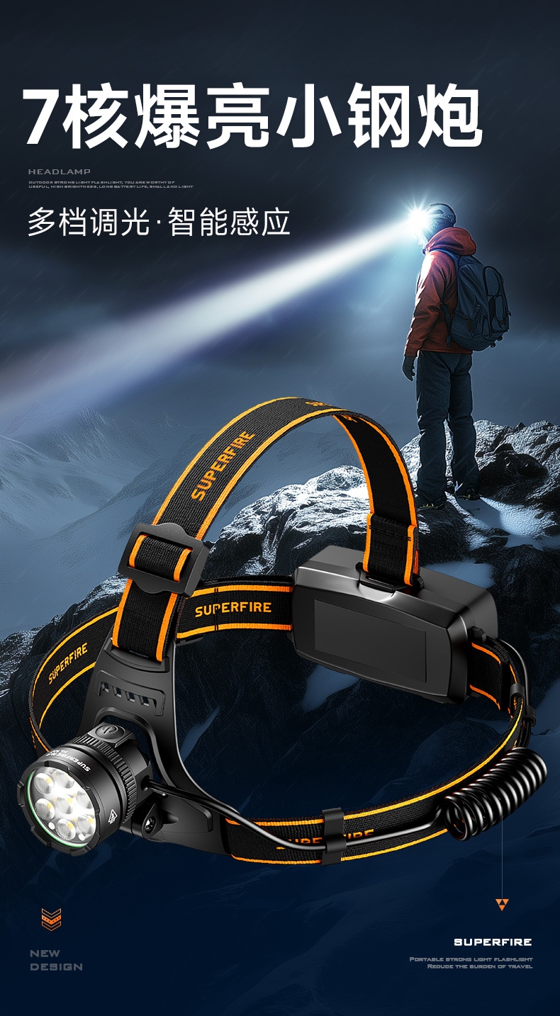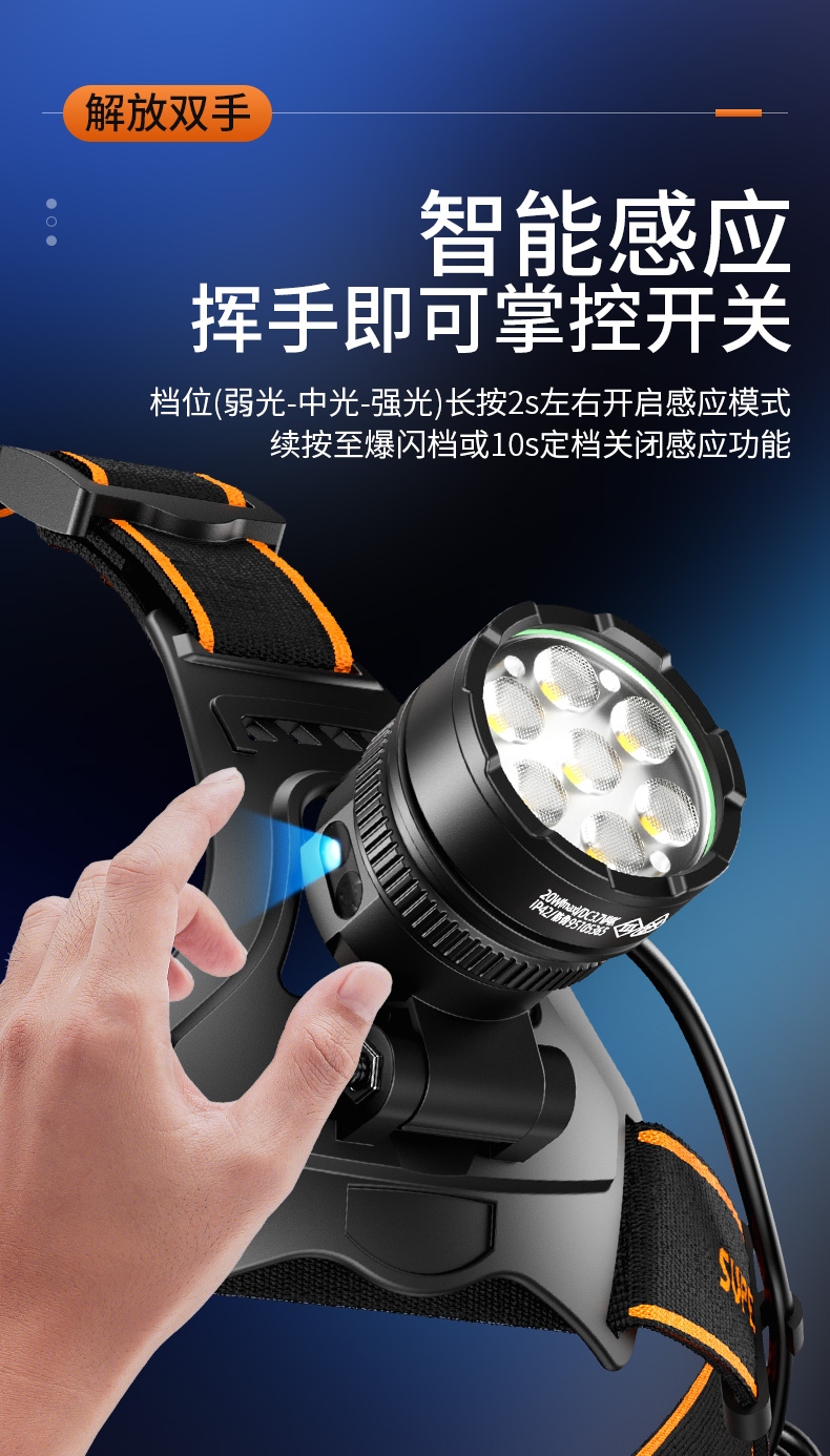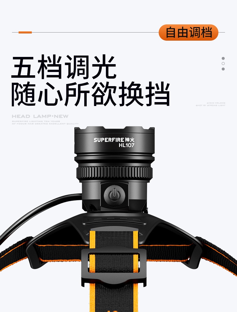强光亮度,运动头灯,前后均衡设计,轻便不压头,可调节式头灯带,佩戴方便舒适,伸缩调焦,光照范围大,照射距离远,头灯角度调节,超90度角度随意调节,适宜各种环境使用