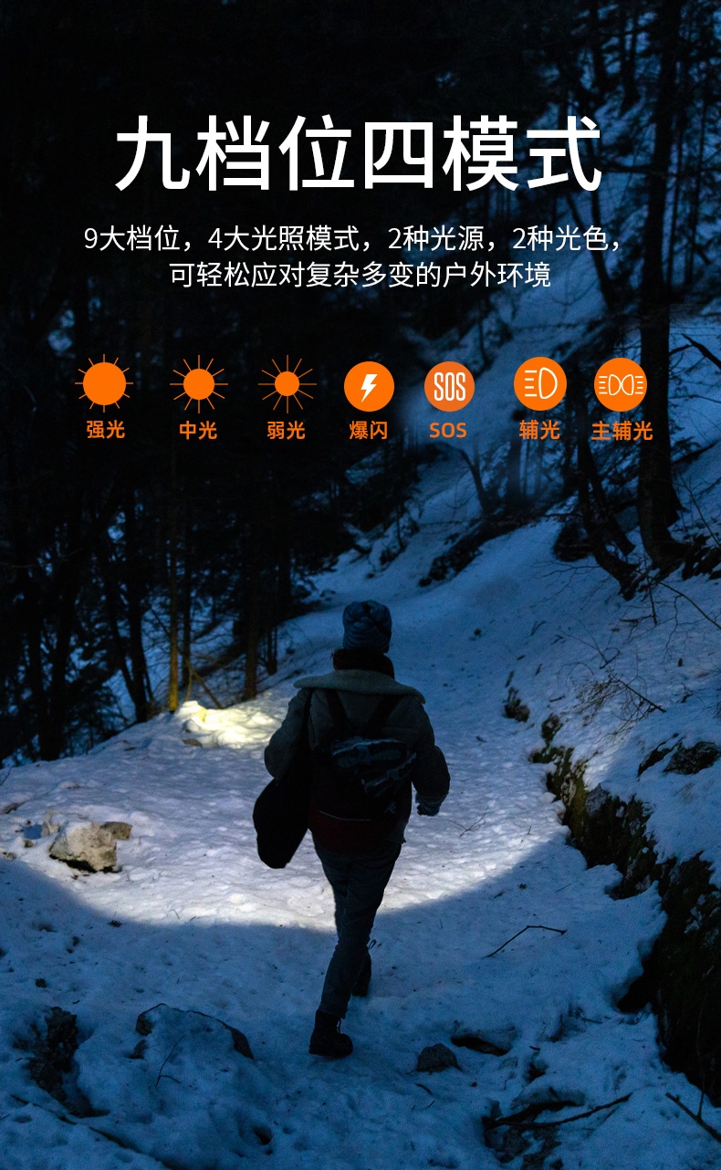 1、单击右边开关开启光源,开启时为强光,续按调档,档位为(强-中-弱-爆闪-SOS-辅光-主辅光-关闭),任意档位状态下,双击开启红光,续按为红光爆
