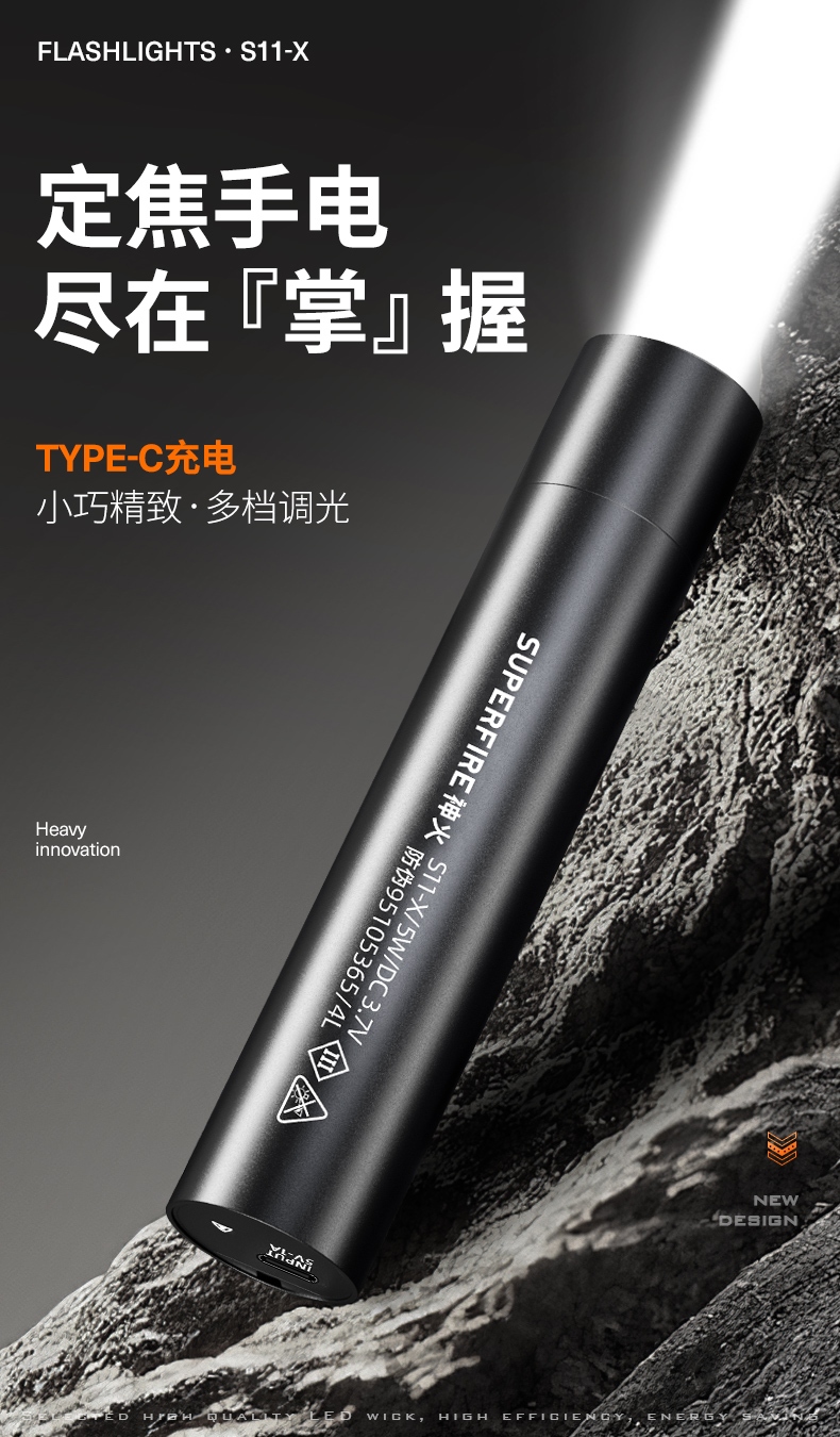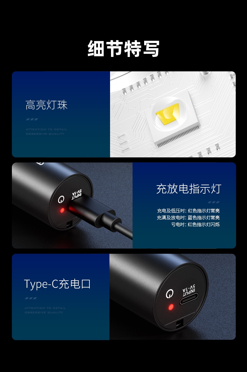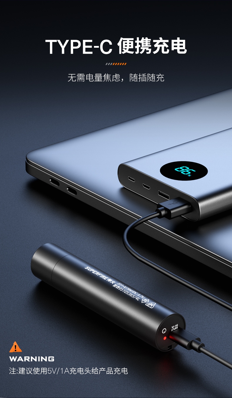 四档调光 Type-C充电 电量显示 铝合金筒身 持久续航 强力防水