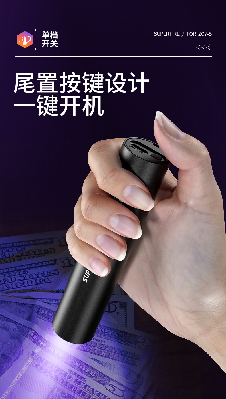 1、紫光手电:多功能,可用于验钞、识别宠物病菌、荧光检测,鉴别琥珀、蜜蜡,古玩修补鉴定、工业探伤等。 2、纯净紫光:365nm紫光,波长短,穿透性强。 3、黑镜,有有效过滤各类杂光,保持紫光纯净,更真实还原产品实际状态。