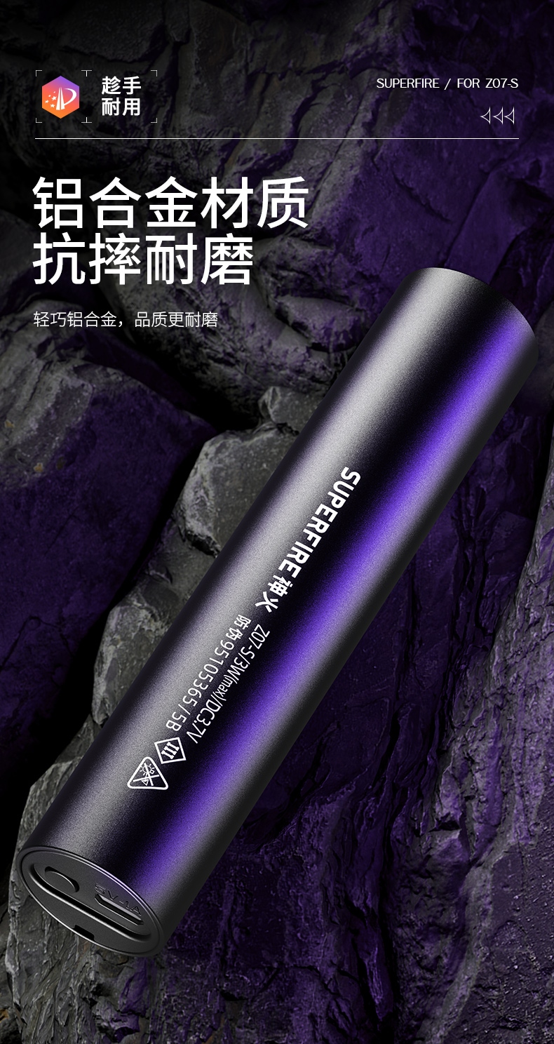 1、紫光手电:多功能,可用于验钞、识别宠物病菌、荧光检测,鉴别琥珀、蜜蜡,古玩修补鉴定、工业探伤等。