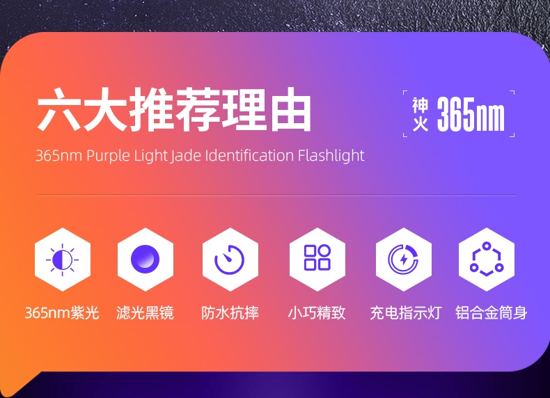6、纯净紫光:365nm紫光,波长短,穿透性强。