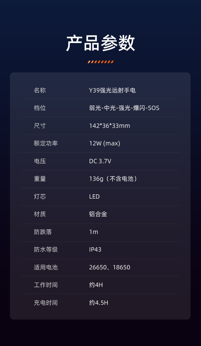 1、多档调光,可满足不同使用场景下的照明需求; 2、含提手,握感更舒适。携带更简单; 3、新型高亮远射灯珠,60W大功率,亮度高,照明效果好。