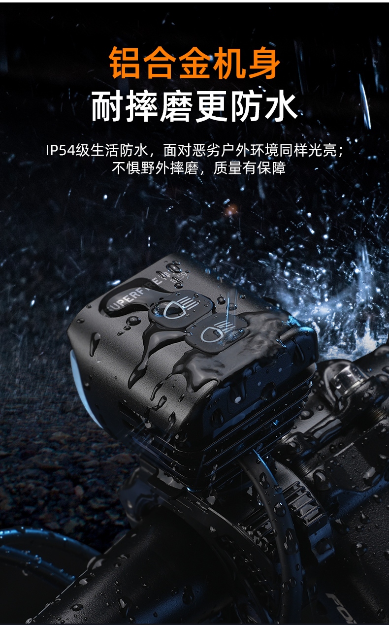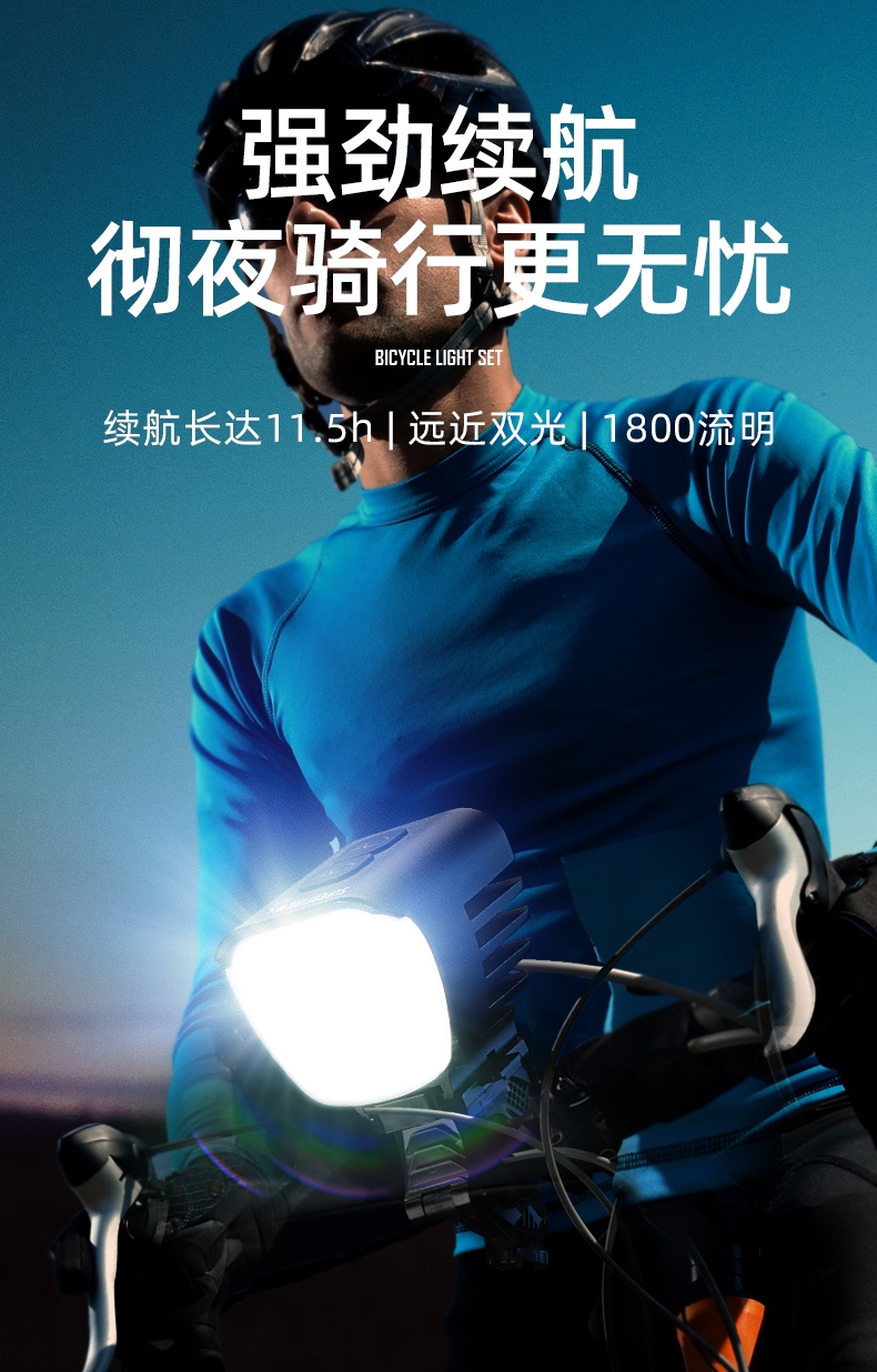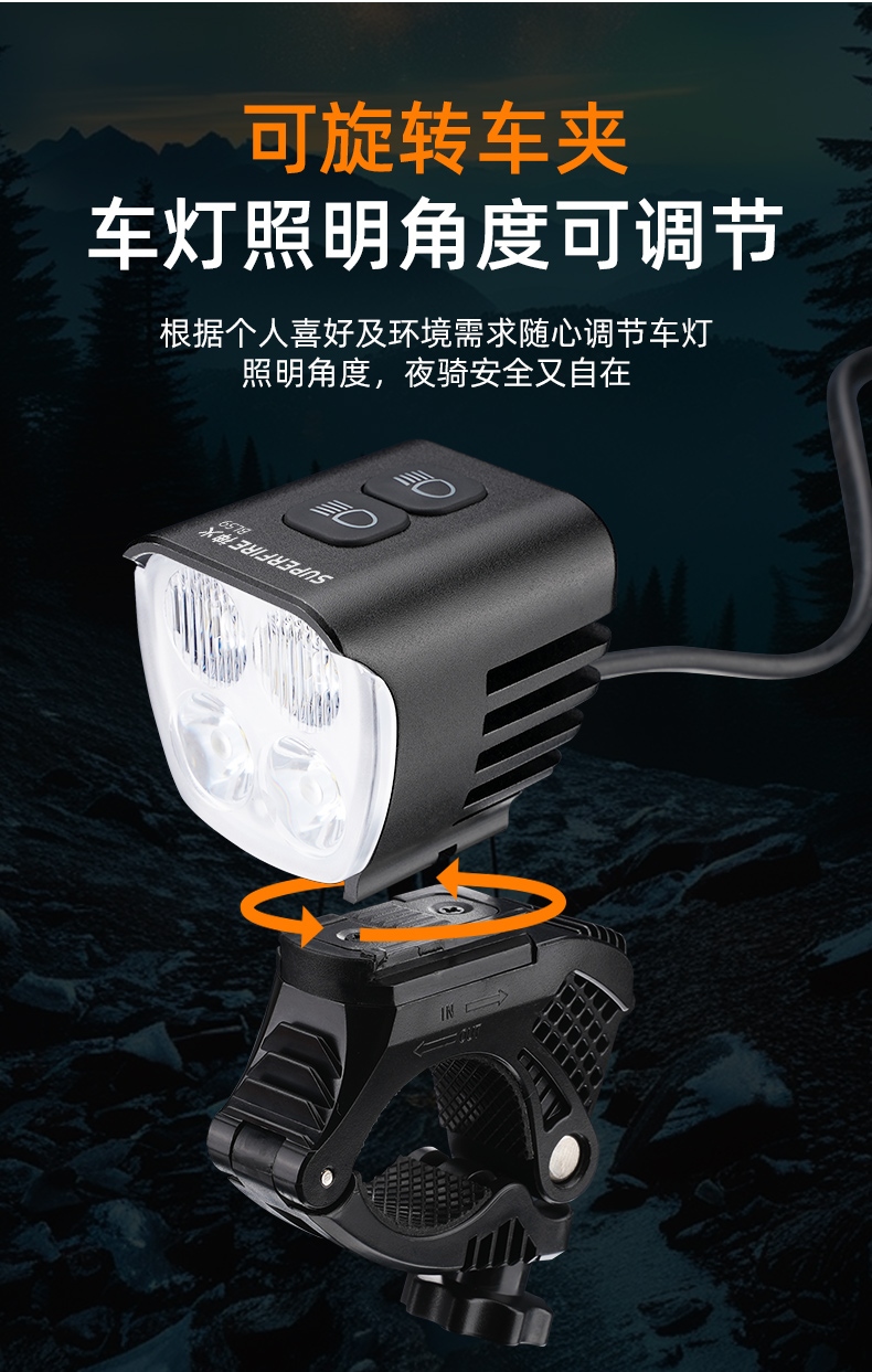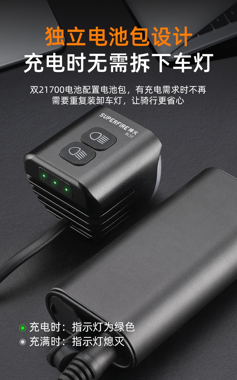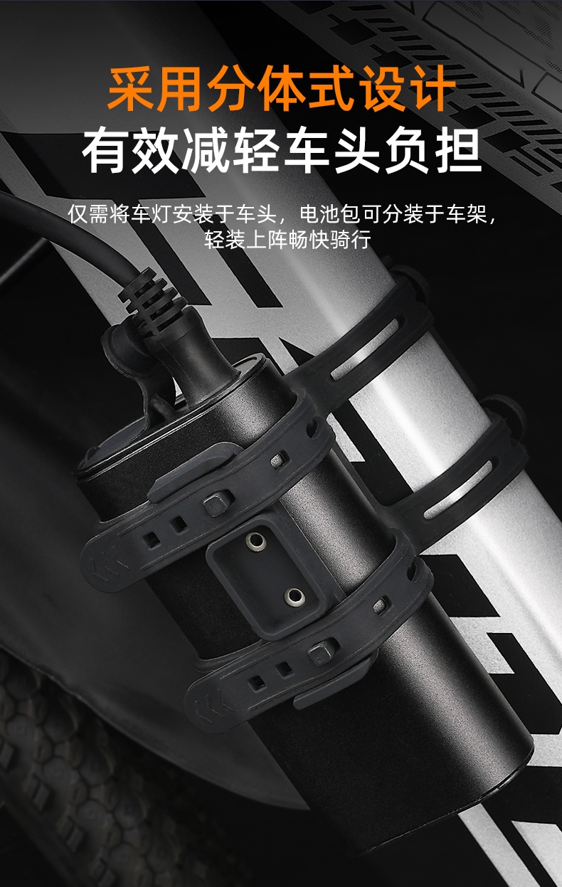 分体式安装大大减轻车头负重;独立电池包,充电无需拆车灯;高亮度1800LM,远近双光(可独立控制),大容量,车头可旋转。