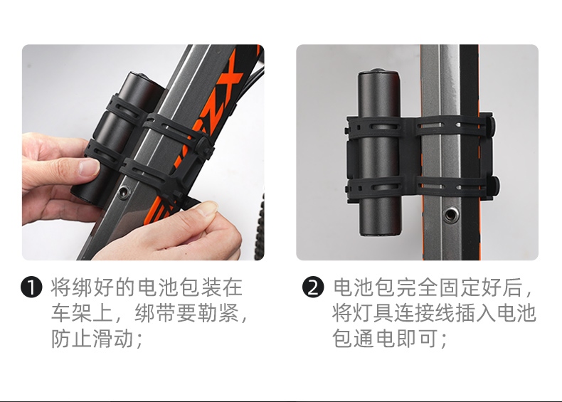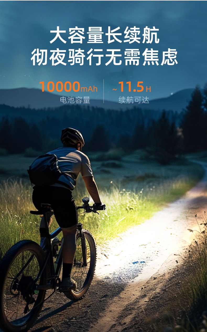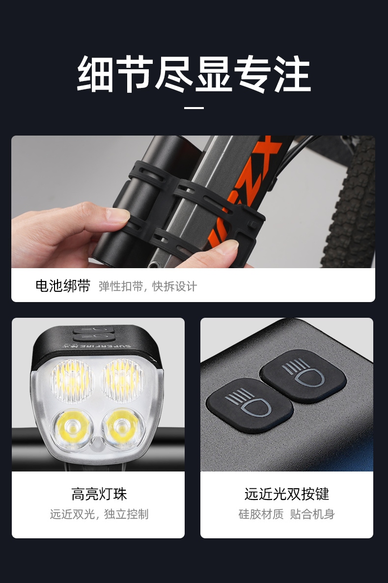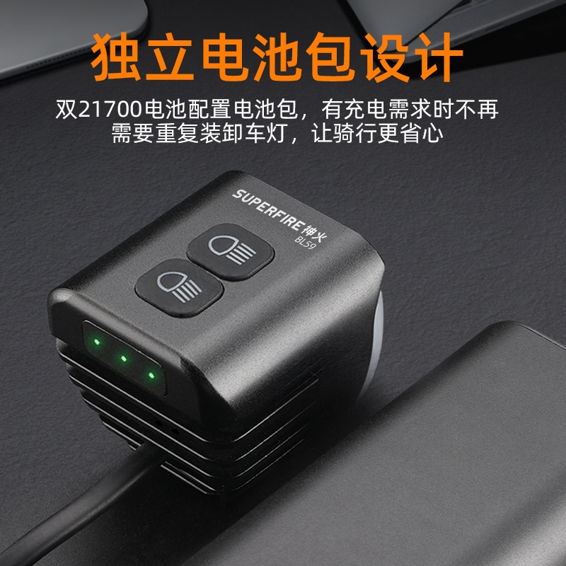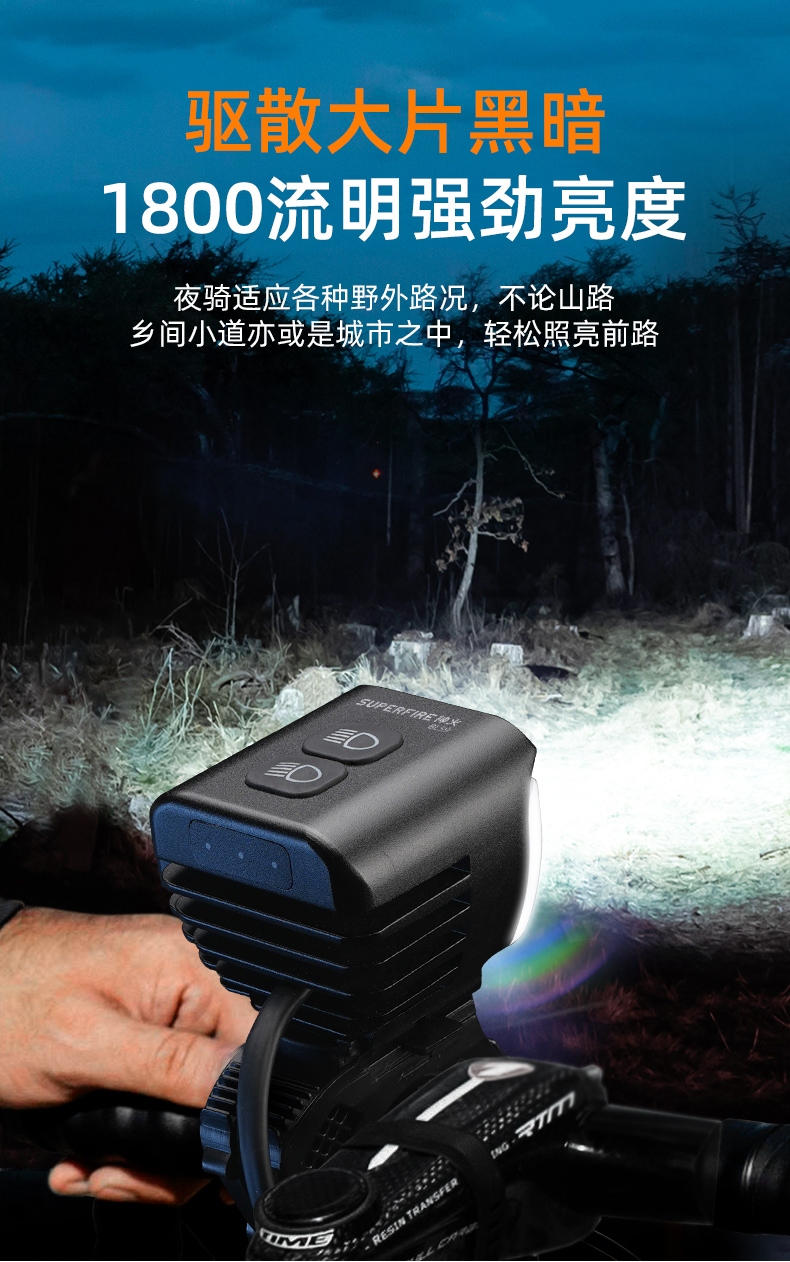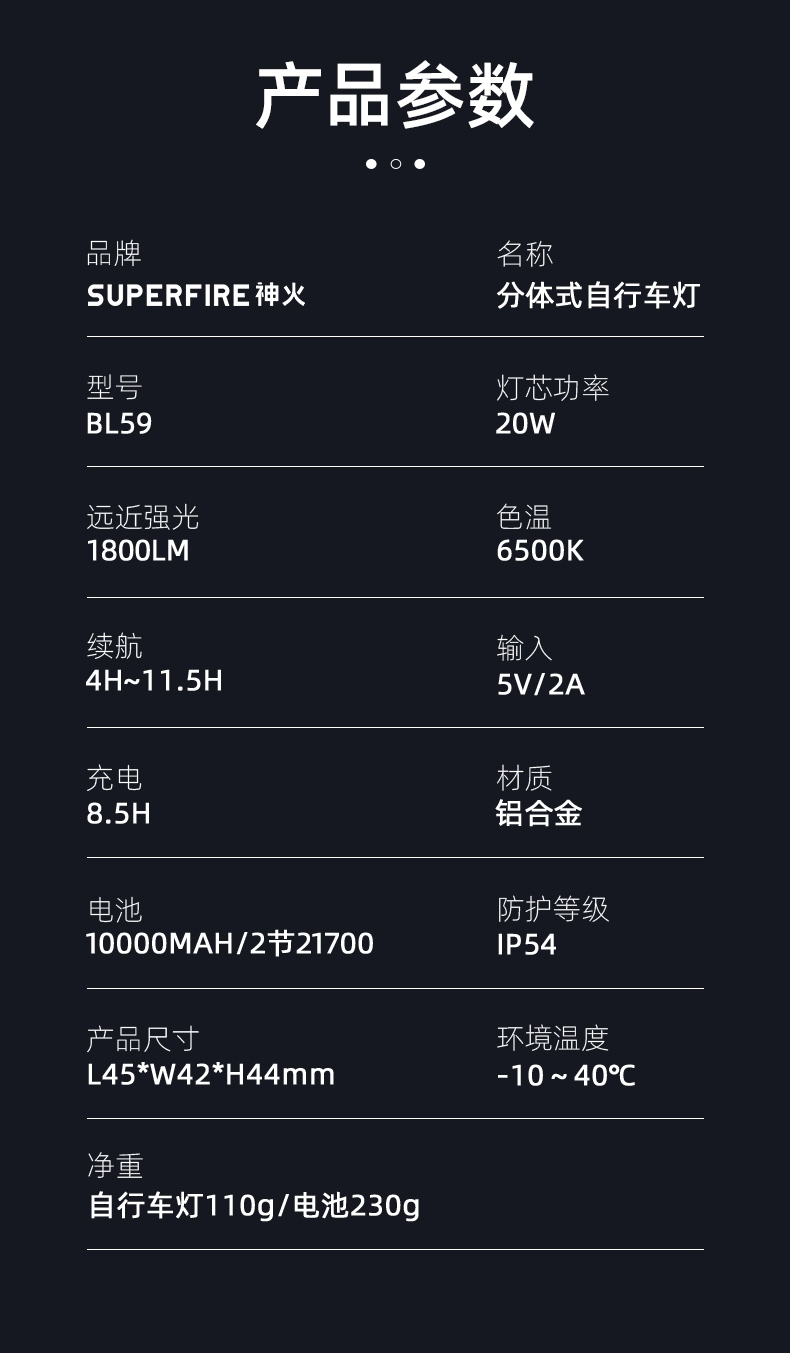 分体式安装大大减轻车头负重;独立电池包,充电无需拆车灯;高亮度1800LM,远近双光(可独立控制),大容量,车头可旋转。