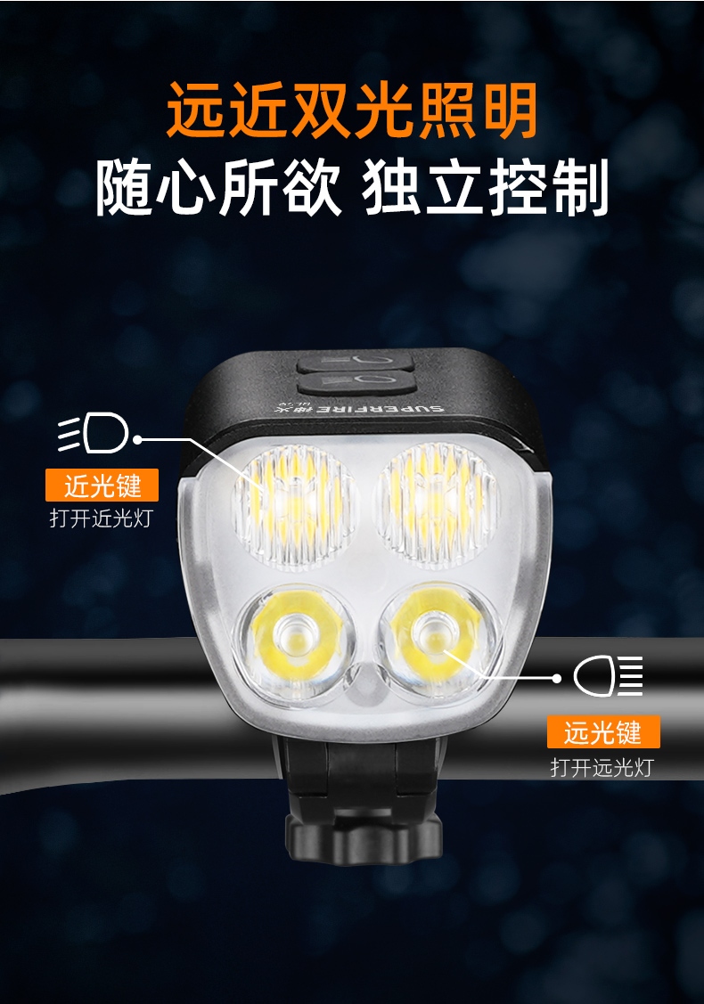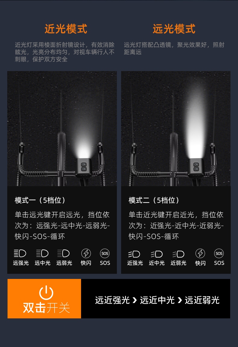 车灯设有远光和近光前后两个按钮,操作如下: 单击前按钮开启远光,挡位依次为:远强光-远中光-远弱光-快闪-SOS-关闭 单击后按钮开启近光,挡位依次为:近强光-近中光-近弱光-快闪-SOS-关闭 前后按钮任意双击开启远近光,挡位依次为:: 远近强光-远近中光-