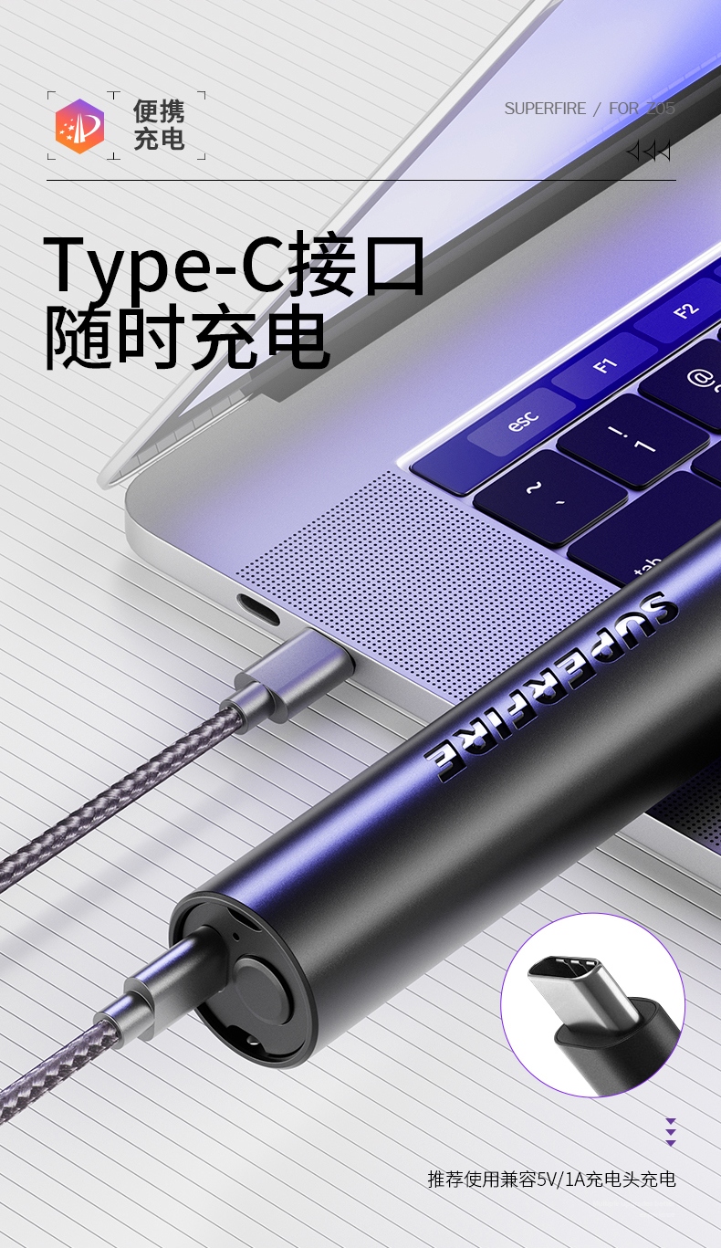 3、多样化充电,使用方便:设有Type-C充电接口,可使用充电器、充电宝、电脑等设备为手电充电。