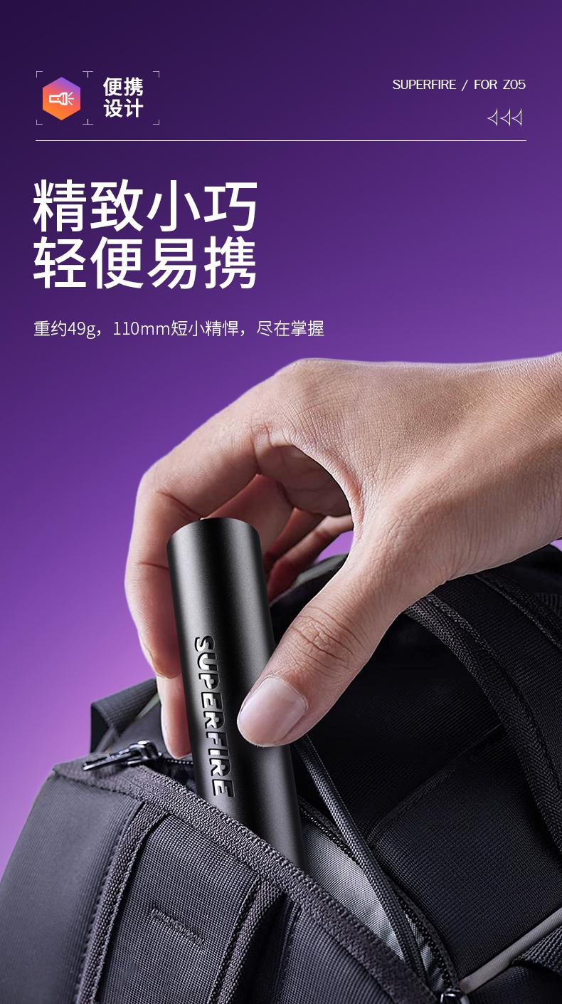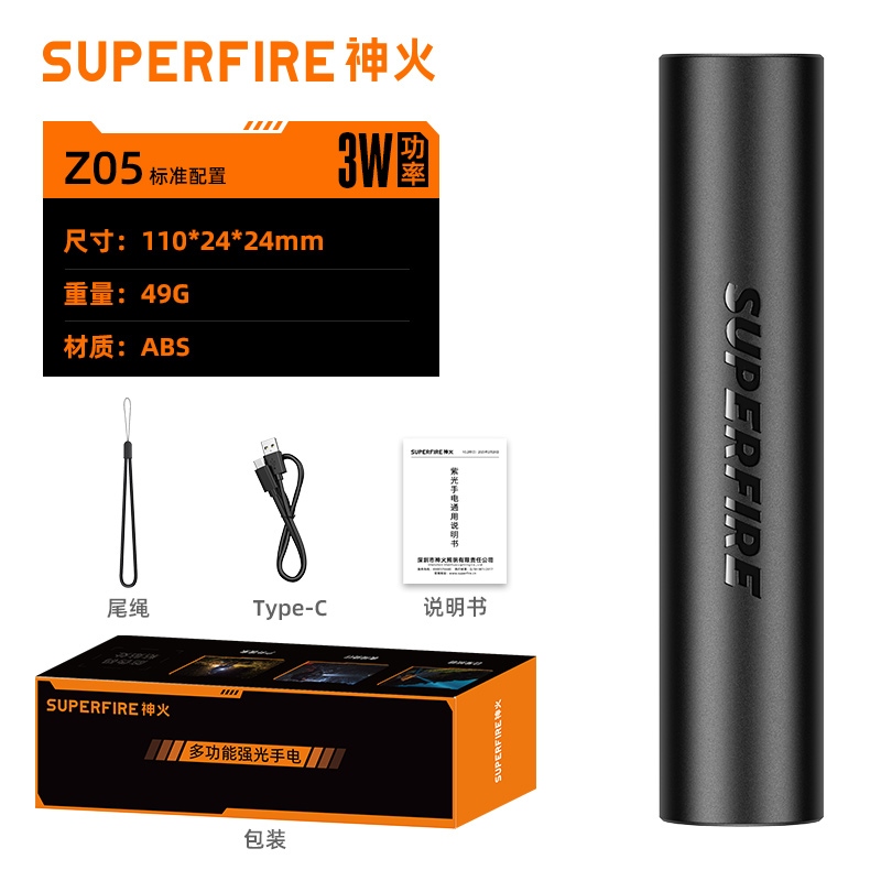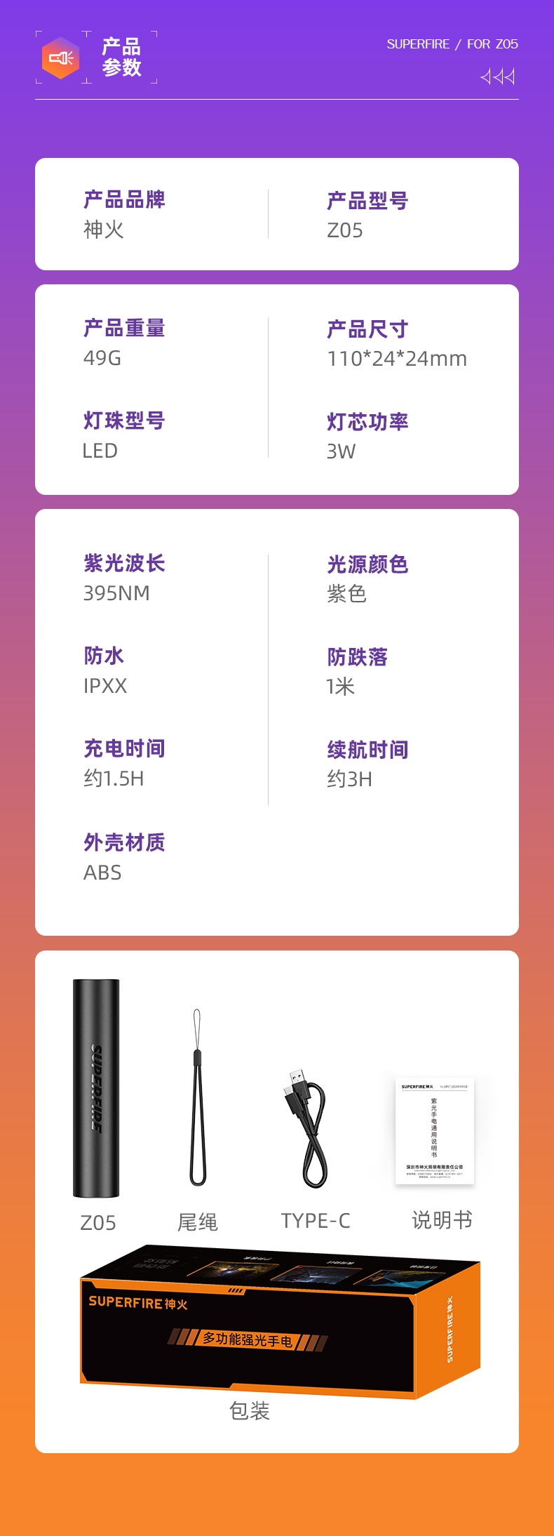 1、紫光手电:可用于验钞、识别荧光剂,宠物荧光检测,鉴别琥珀、蜜蜡,古玩修补鉴定。 2、单档开关,操作便捷。 3、多样化充电,使用方便:设有Type-C充电接口,可使用充电器、充电宝、电脑等设备为手电充电。