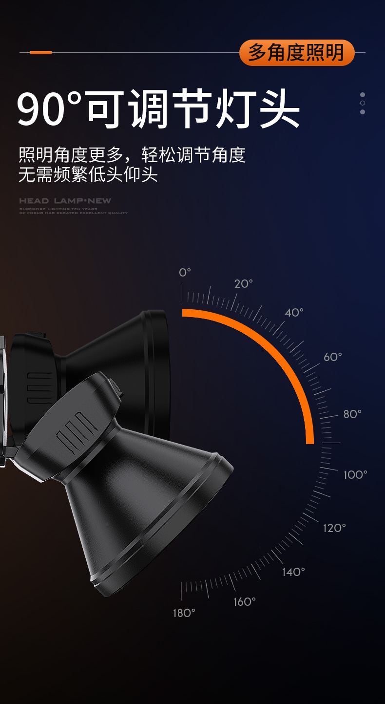 3、头灯角度调节:超90°角度随意调节,适宜各环境使用。