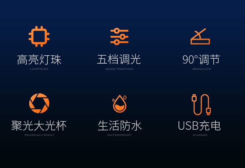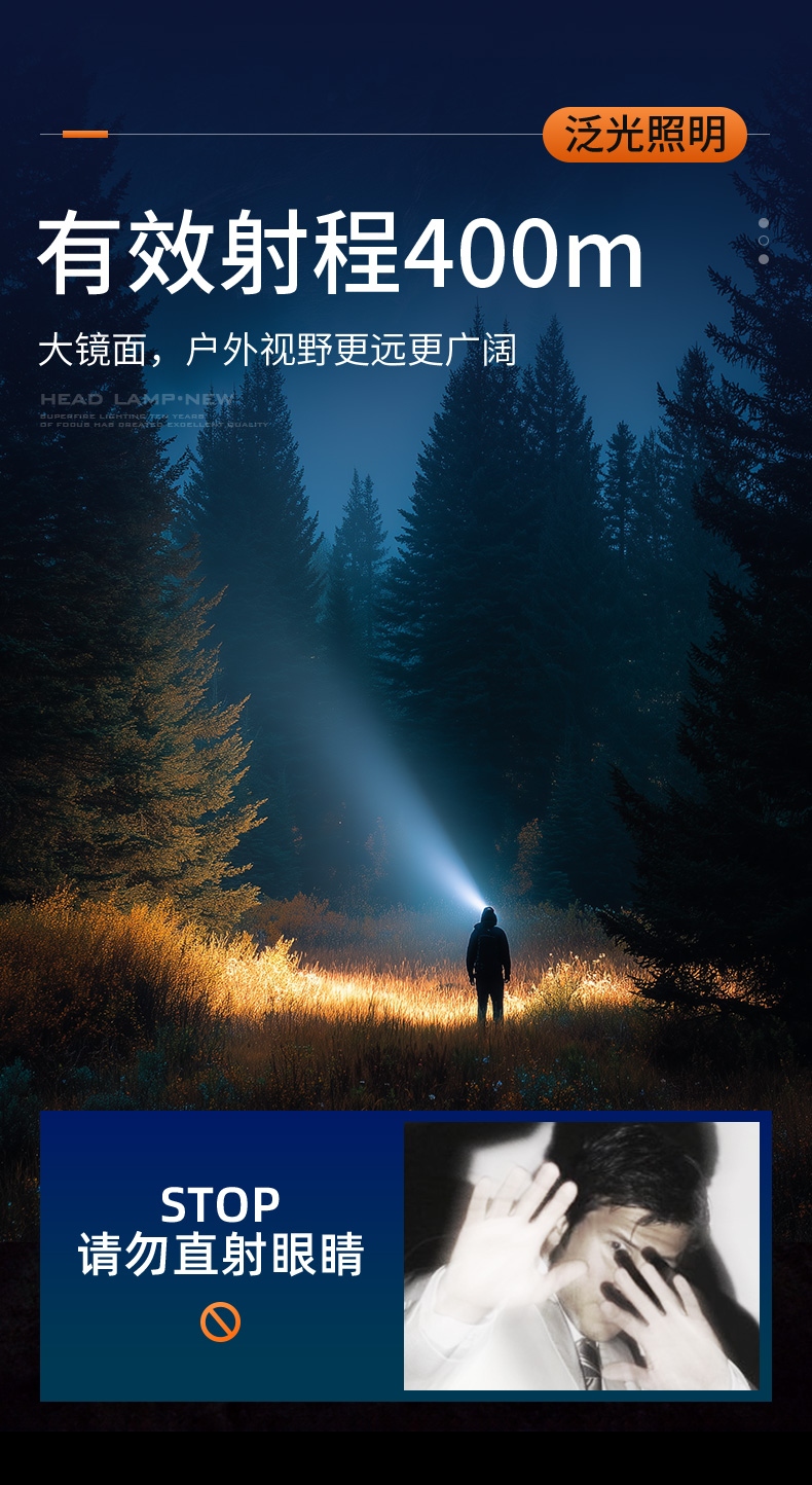 强光亮度,运动头灯,前后均衡设计,轻便不压头,可调节式头灯带,佩戴方便舒适,伸缩调焦,光照范围大,照射距离远,头灯角度调节,超90度角度随意调节,适宜各种环境使用