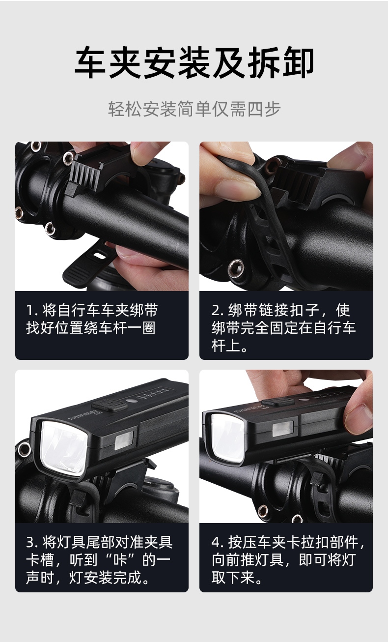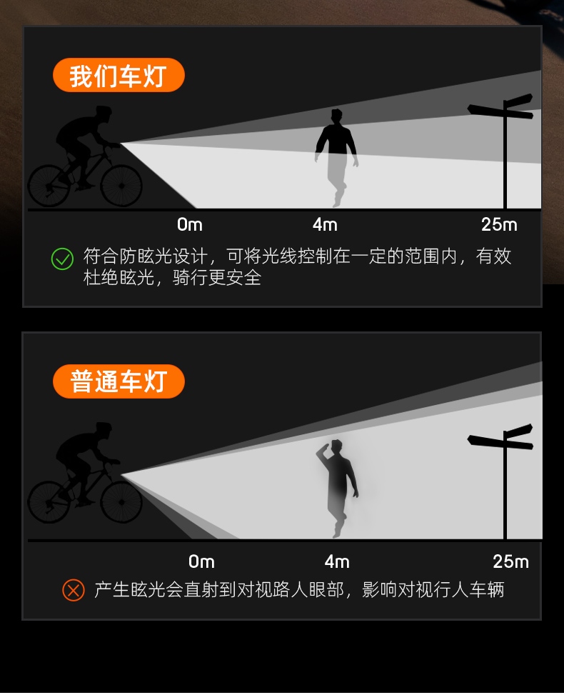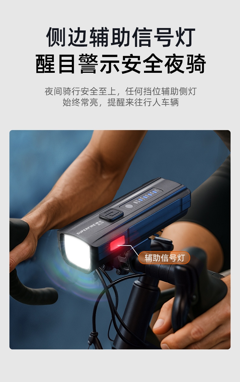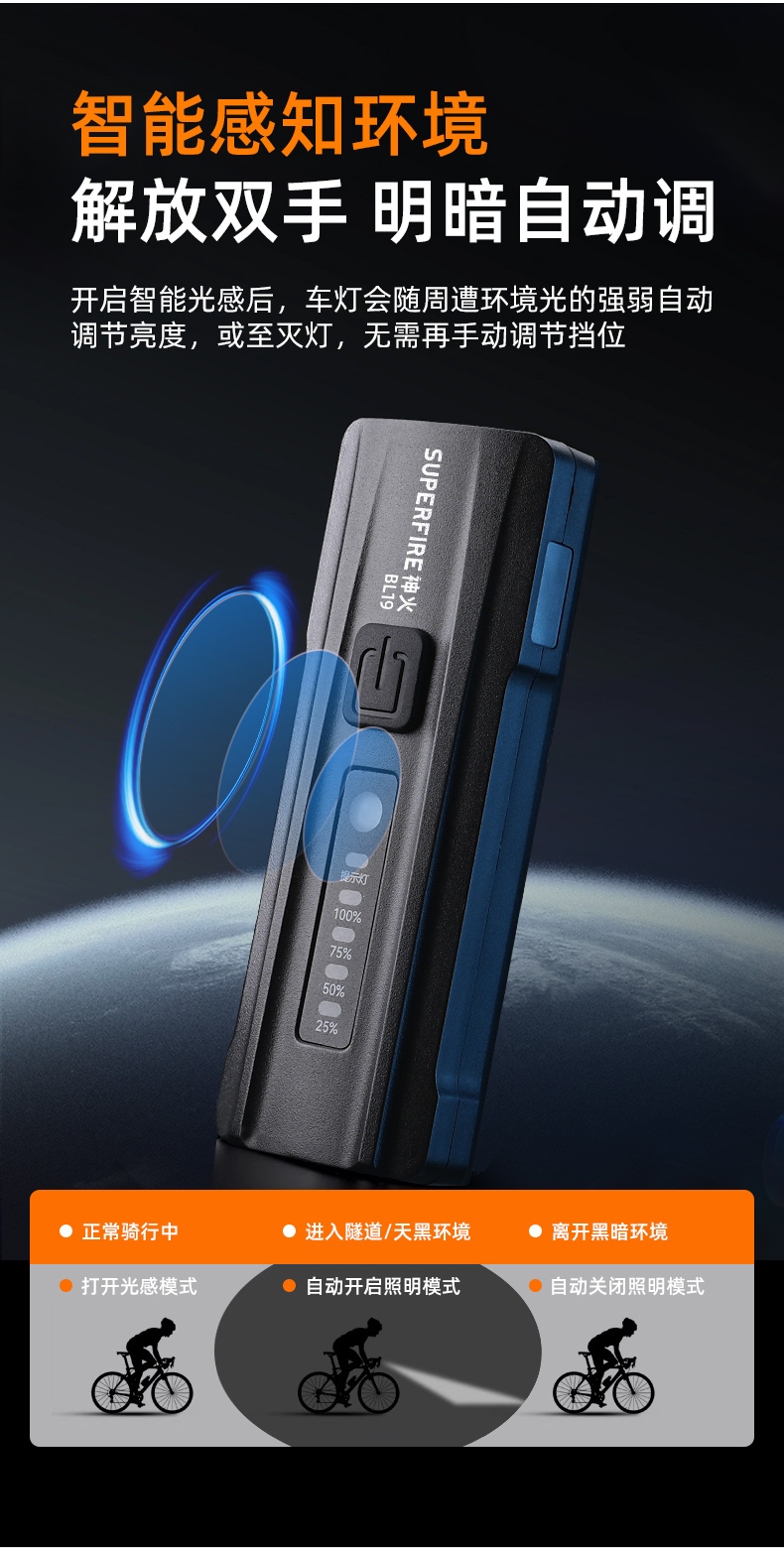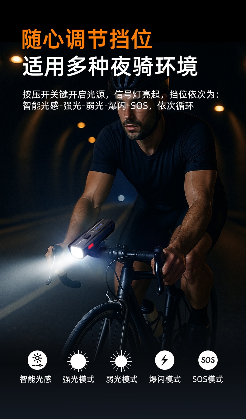1,按压开关键开启光源,信号灯亮起,档位依次为:智能光感-强光-弱光-爆闪-SOS,依次循环,任意档位长按关灯。信号灯为辅助灯光,任意档位都会长亮。 2、智能光感:灯具会随着环境光的强弱自动调节车灯的亮度及灭灯。
