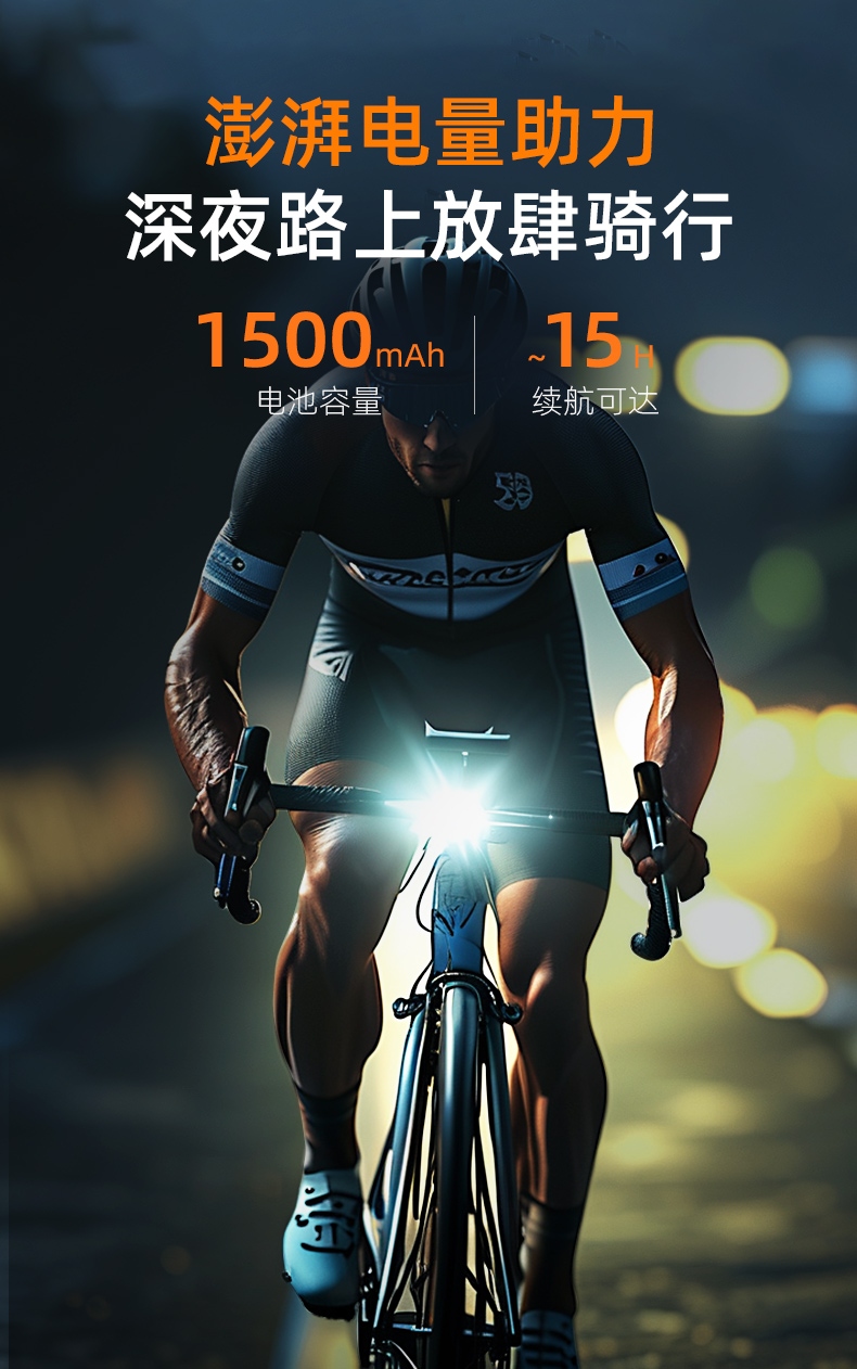 聚光主灯 亮度随心 轻按后端开关按钮,主灯强光点亮,续按依次切换主灯工作光-爆闪光。主灯开启状态下长按5秒,可实现光源色温转换。主灯关闭状态下长按5秒,可开启灯具最亮照明模式。 爆亮强光 亮如白昼 1500LM大功率高亮光源,点亮顷刻如白昼