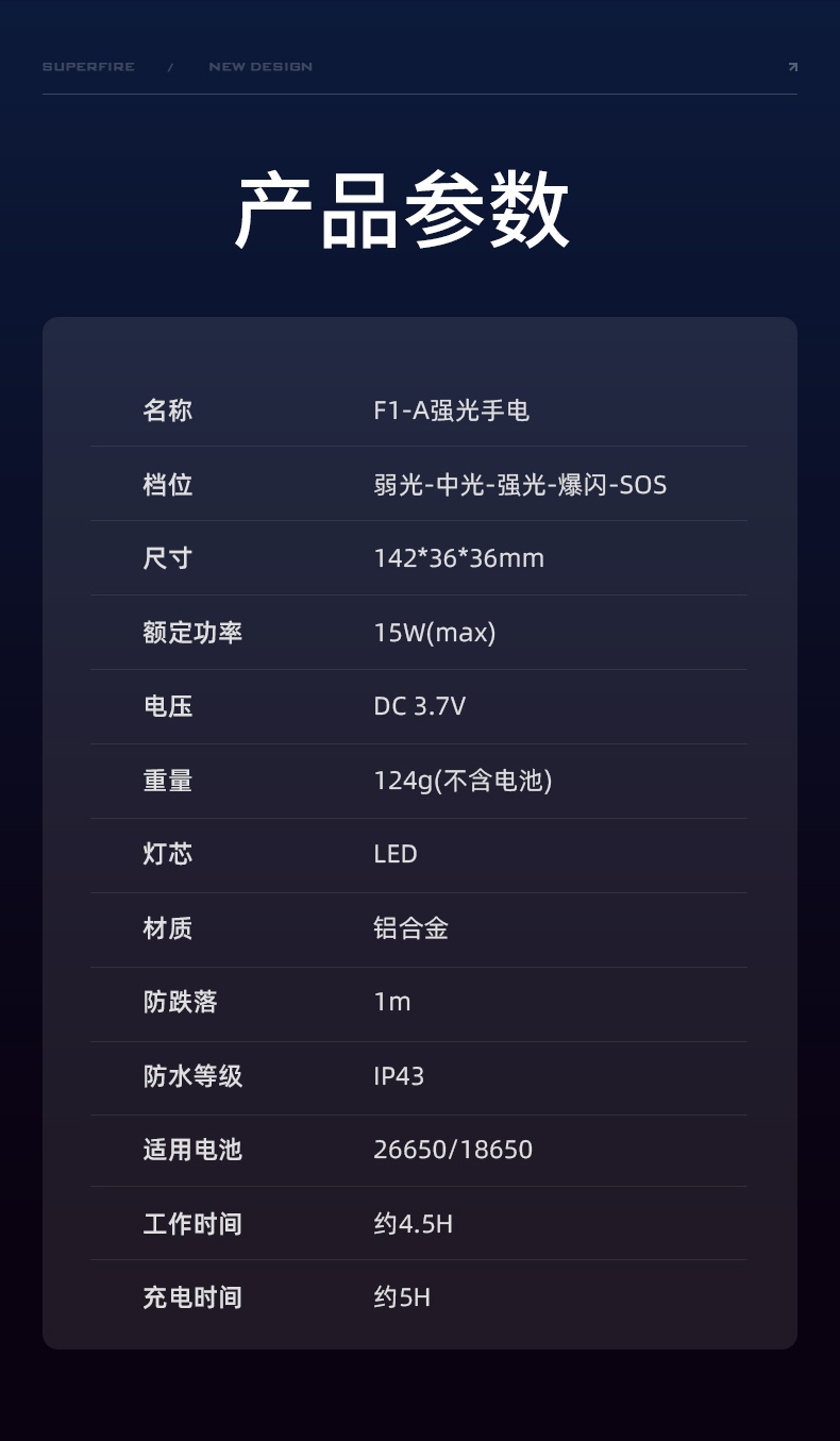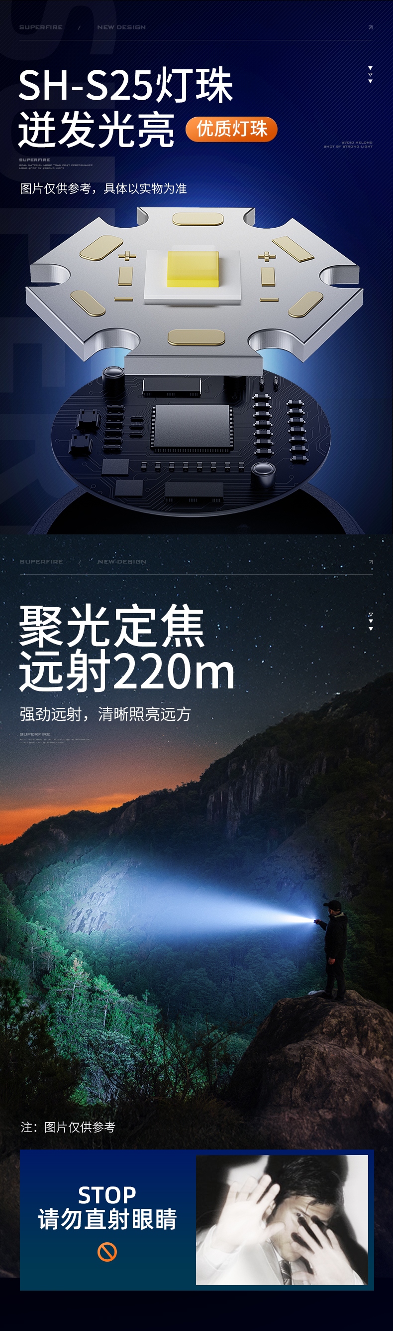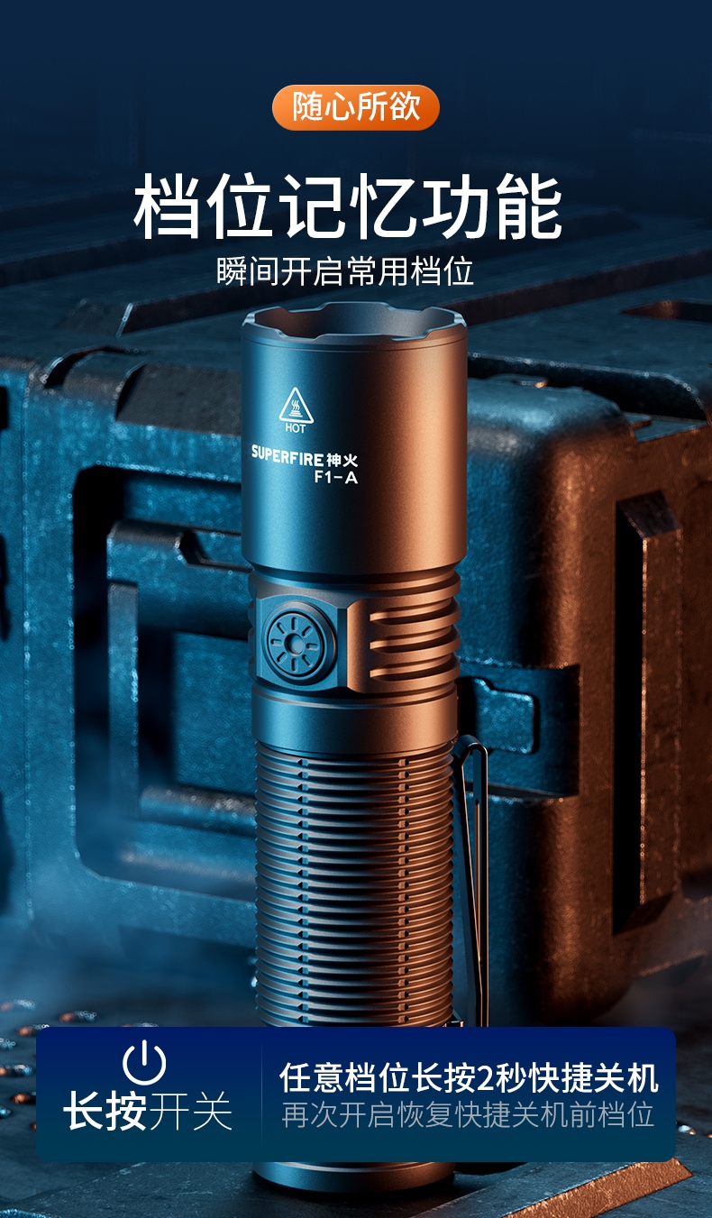 1、多档调光,可满足不同使用场景下的照明需求。 2、多种安全程序,可有效保护手电使用安全,延长手电使用寿命。 3、定焦手电,单手操控,简单方便。