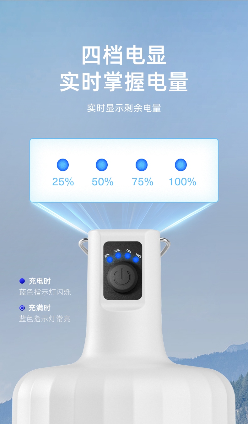 1.按压灯头开关按钮开启即强光档,续按调档。3个档位,以强光-中光-弱光-关依次循环,任意档位长按2S关机,含档位记忆。 2.多样化充电,使用方便:可使用充电器、充电宝、电脑等设备为灯具充电。充电时可边充电边使用照明功能。 3.智能电显,一目了然。