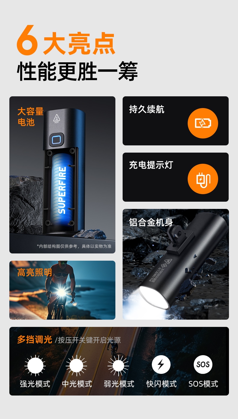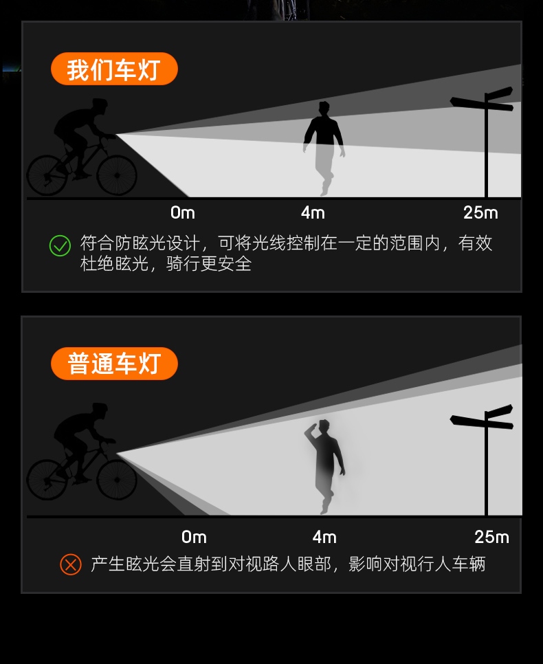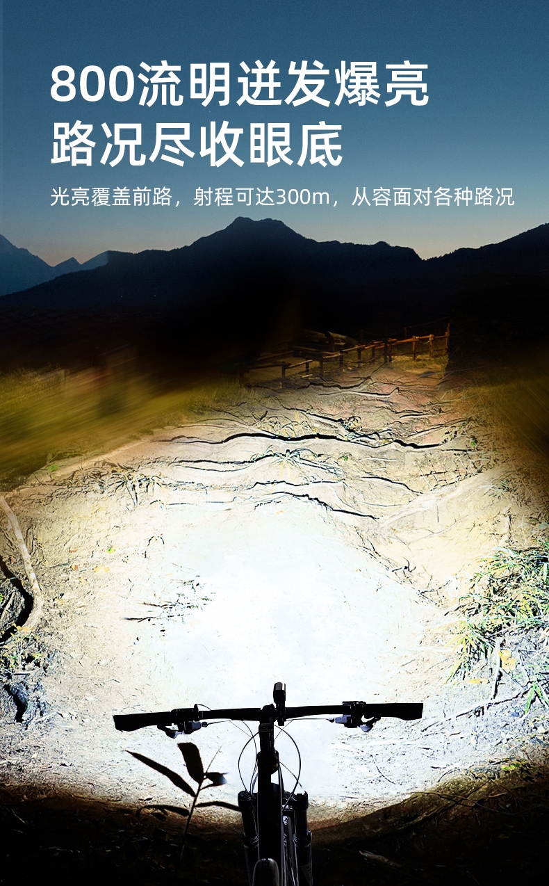 1、800流明进发爆亮,路况尽收眼底,光亮覆盖前路,射程可达300m,从容面对各种路况;
