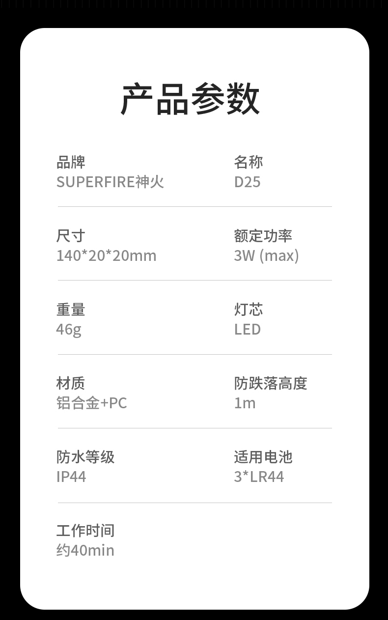 1、千米远射,射程更远,光斑更聚焦。 2、进口灯珠,亮度高,照明效果更好。 3、前后双按键,光源一键点亮,高亮瞬间开启。